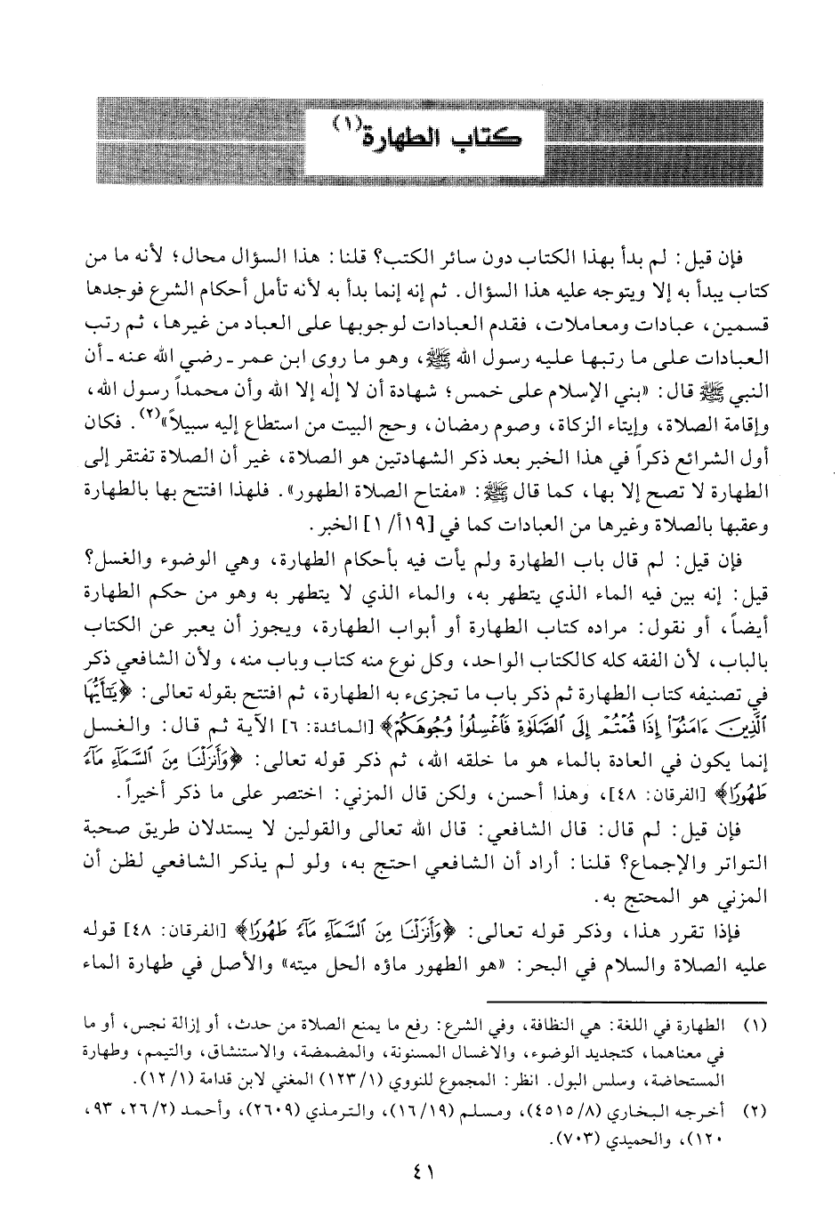 فإن قيل: لم بدأ بهذا الكتاب دون سائر الكتب؟ قلنا: هذا السؤال محال؛ لأنه ما من كتاب يبدأ به إلا ويتوجه عليه هذا السؤال. ثم أنه إنما بدأ به لأنه تأمل أحكام الشرع فوجدها قسمين، عبادات ومعاملات، فقدم العبادات لوجوبها على العباد من غيرها، ثم رتب العبادات على ما رتبها عليه رسول الله صلى الله عليه وسلم، وهو ما روى ابن عمر - رضي الله عنه - أن النبي صلى الله عليه وسلم قال: "بني الإسلام على خمس؛ شهادة أن لا إله إلا الله وأن محمدًا رسول الله، وإقامة الصلاة، وإيتاء الزكاة، وصوم رمضان، وحج البيت من استطاع إليه سبيلًا". فكان أول الشرائع ذكرًا في هذا الخبر بعد ذكر الشهادتين هو الصلاة، غير أن الصلاة تفتقر إلى الطهارة لا تصح إلا بها، كما قال صلى الله عليه وسلم: "مفتاح الصلاة الطهور". فلهذا افتتح بها بالطهارة وعقبها بالصلاة وغيرها من العبادات كما في [19 أ/ 1] الخبر.