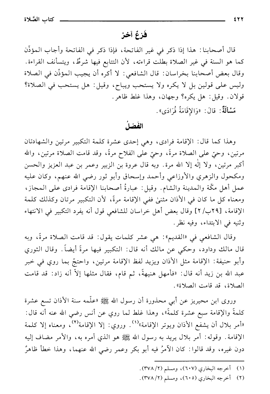 وهذا كما قال: الإقامة فرادى، وهي إحدى عشرة كلمة التكبير مرتين، والشهادتان مرتين، وحي على الصلاة مرة، وحي على الفلاح مرة، وقد قامت الصلاة مرتين، والله أكبر مرتين، ولا إله إلا الله مرة. وبه قال عروة بن الزبير وعمر بن عبد العزيز والحسن ومكحول والزهري والأوزاعي وأحمد وإسحاق وأبو ثور رضي الله عنهم، وكان عليه عمل أهل مكة والمدينة والشام. وقيل: عبارة أصحابنا الإقامة فرادى على المجاز، ومعناه كل ما كان في الأذان مثنى ففي الإقامة مرة، لأن التكبير مرتان وكذلك كلمة الإقامة [29 ب/ 2] وقال بعض أهل خراسان للشافعي قول أنه يفرد التكبير في الانتهاء وثنيه في الابتداء، وفيه نظر.