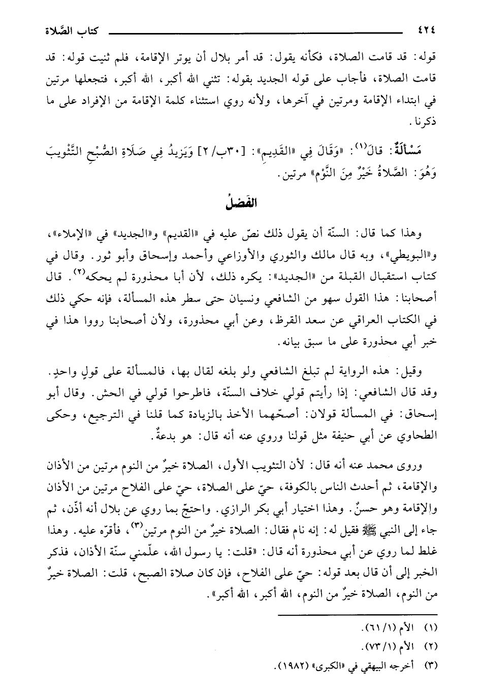 وروى محمد عنه أنه قال: لأن التثويب الأول، الصلاة خير من النوم مرتين من الأذان والإقامة، ثم أحدث الناس بالكوفة، حي على الصلاة، حي على الفلاح مرتين من الأذان والإقامة وهو حسن. وهذا اختيار أبي بكر الرازي. واحتج بما روي عن بلال أنه أذن، ثم جاء إلى النبي صلى الله عليه وسلم فقيل له: إنه نام فقال: الصلاة خير من النوم مرتين، فأقره عليه. وهذا غلط لما روي عن أبي محذورة أنه قال: «قلت: يا رسول الله، علمني سنة الأذان، فذكر الخبر إلى أن قال بعد قوله: حي على الفلاح، فإن كان صلاة الصبح، قلت: الصلاة خير من النوم، الصلاة خير من النوم، الله أكبر، الله أكبر».