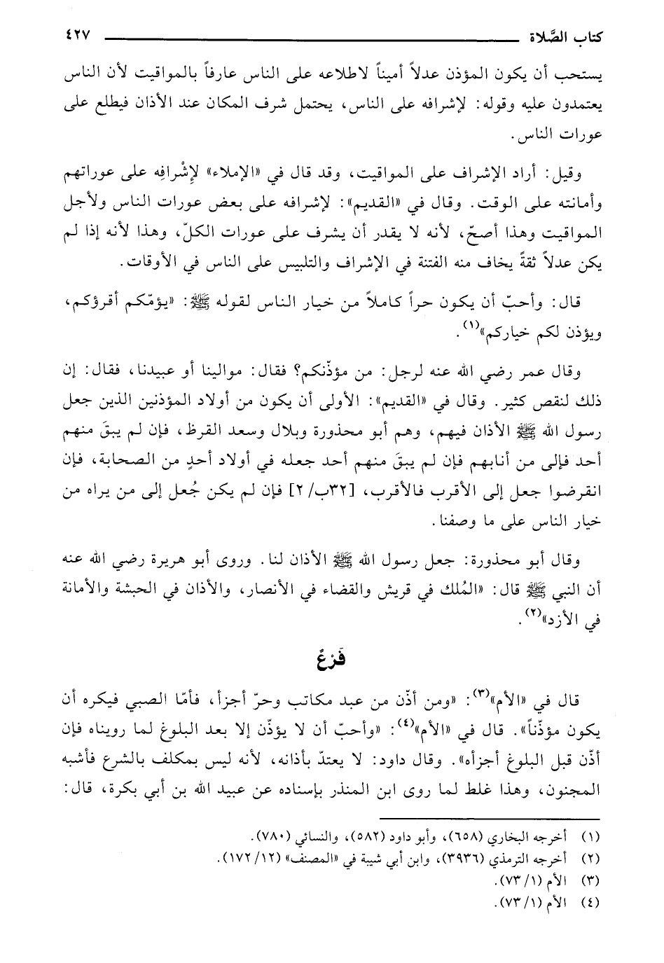 يستحب أن يكون المؤذن عدلاً أميناً لاطلاعه على الناس عارفاً بالمواقيت لأن الناس يعتمدون عليه وقوله: لإشرافه على الناس، يحتمل شرف المكان عند الأذان فيطلع على عورات الناس.