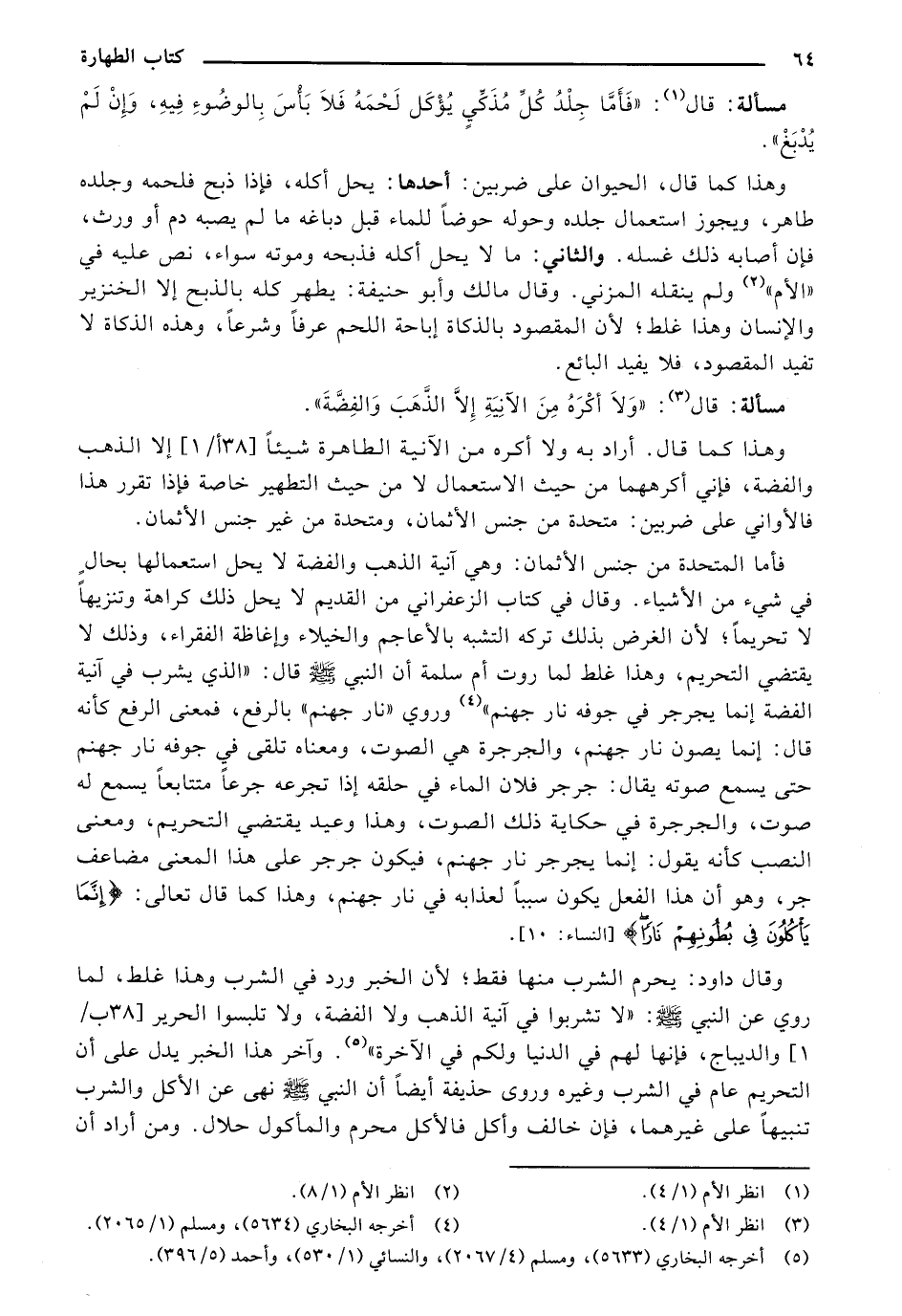 شيء من الأشياء. وقال في كتاب الزعفراني من القديم لا يحل ذلك كراهة وتنزيها لا تحريماً؛ لأن الغرض بذلك تركه التشبه بالأعاجم والخيلاء وإغاظة الفقراء، وذلك لا يقتضي التحريم، وهذا غلط لما روت أم سلمة أن النبي صلى الله عليه وسلم قال: "الذي يشرب في آنية الفضة إنما يجرجر في جوفه نار جهنم". وروي "نار جهنم" بالرفع، فمعنى الرفع كأنه قال: إنما يصون نار جهنم، والجرجرة هي الصوت، ومعناه تلقى في جوفه نار جهنم حتى يسمع صوته يقال: جرجر فلان الماء في حلقه إذا تجرعه جرعاً متتابعاً يسمع له صوت، والجرجرة في حكاية ذلك الصوت، وهذا وعيد يقتضي التحريم، ومعنى النصب كأنه يقول: إنما يجرجر نار جهنم، فيكون جرجر على هذا المعنى مضاعف جر، وهو أن هذا الفعل يكون سبباً لعذابه في نار جهنم، وهذا كما قال تعالى: {إنَّمَا يَاكُلُونَ فِي بُطُونِهِمْ نَارًا} [النساء: 10]
