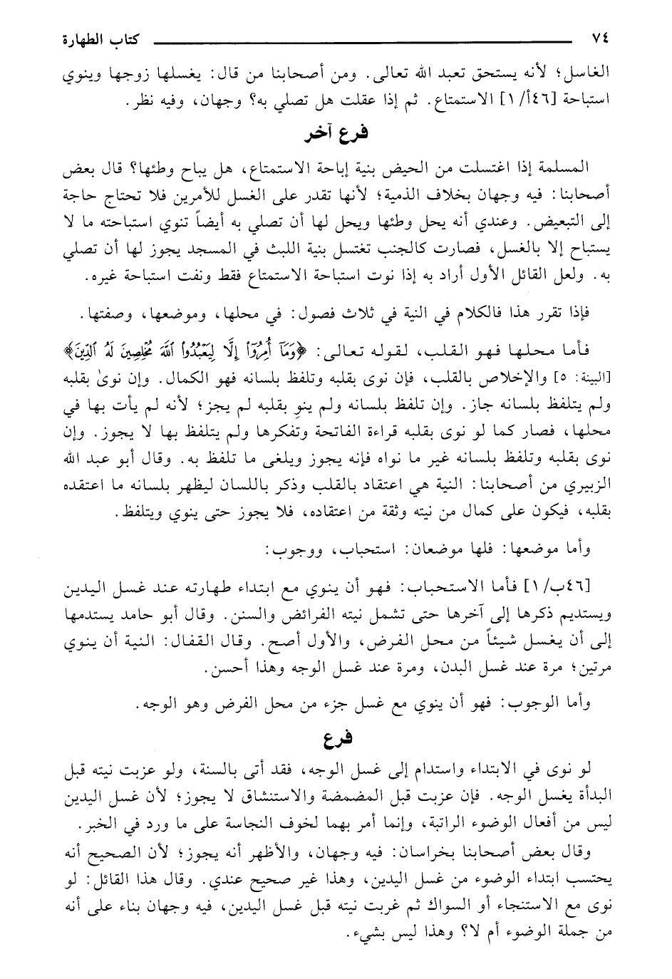المسلمة إذا اغتسلت من الحيض بنية إباحة الاستمتاع، هل يباح وطئها؟ قال بعض أصحابنا: فيه وجهان بخلاف الذمية؛ لأنها تقدر على الغسل للأمرين فلا تحتاج حاجة إلى التبعيض. وعندي انه يحل وطئها ويحل لها أن تصلي به أيضاً تنوي استباحته ما لا يستباح إلا بالغسل، فصارت كالجنب تغتسل بنية الله في المسجد يجوز لها أن تصلي به. ولعل القائل الأول أراد به إذا نوت استباحة الاستمتاع فقط وتفت استباحة غيره.
