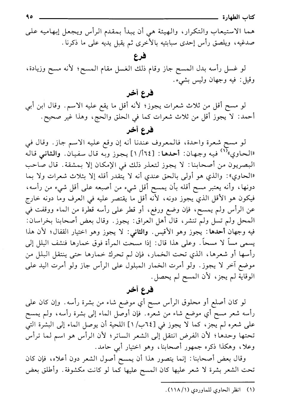 لو مسح شعرة واحدة، فالمعروف عندنا أنه إن وقع عليه الاسم جاز. وقال في "الحاوي" فيه وجهان: أحدهما: [162 أ/ 1] يجوز وبه قال سفيان. والثاني قاله البصريون من أصحابنا: لا يجوز لتعذر ذلك في الإمكان إلا بمشقة. قال صاحب "الحاوي": والذي هو أولى بالحق عندي أنه لا يتقدر أقله إلا بثلاث شعرات ولا بما دونها، وأنه يعتبر مسح أقله بأن يمسح أقل شيء من أصبعه على أقل شيء من رأسه، فيكون هو الأقل الذي يجوز دونه، لأنه أقل من يقتصر عليه في العرف وما دونه خارج عن الرأس ولم يمسح، فإن وضع ورفع، أو قطر على رأسه قطرة من الماء ووقفت في المحل ولم تسل ولم تنشتر، قال أهل العراق: يجوز. وقال بعض أصحابنا بخراسان: فيه وجهان أحدهما: يجوز وهو الأقيس. والثاني: لا يجوز وهو اختيار القفال؛ لأن هذا يسمى مسًا لا مسحًا. وعلى هذا قال: إذا مسحت المرأة فوق خمارها فنشف البلل إلى رأسها أو شعرها، الذي تحت الخمار، فإن لم تحرك خمارها حتى ينتقل البلل من موضع آخر لا يجوز. ولو أمرت الخمار المبلول على الرأس جاز ولو أمرت اليد على الوقاية لم يجز، لأن المسح لم يحصل.