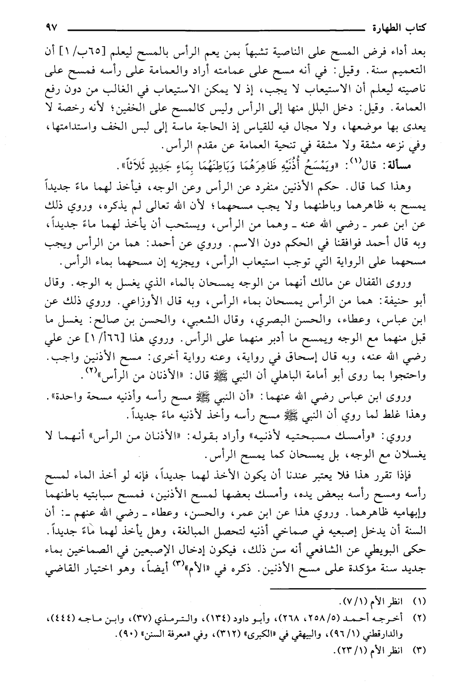 وروي ابن عباس رضي الله عنهما: "أن النبي صلى الله عليه وسلم مسح رأسه وأذنيه مسحة واحدة". وهذا غلط لما روي أن النبي صلى الله عليه وسلم مسح رأسه وأخذ ماًء جديدًا.