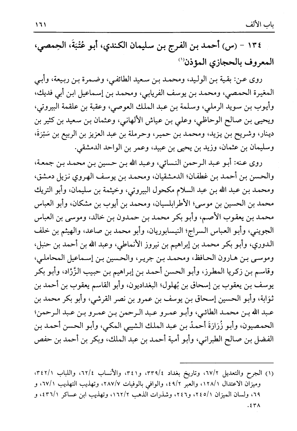 ١٣٤ - (س) أحمد بن الفرج بن سليمان الكندي، أبو عُتْبَةَ، الحِمصي، المعروف بالحجازي المؤذن (¬١)