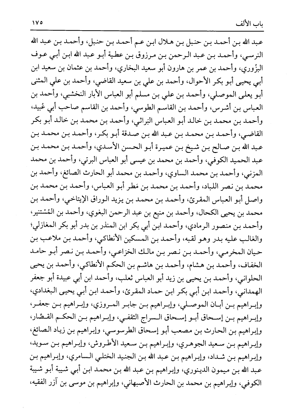 عبد اللَّه بن أحمد بن حنبل بن هلال ابن عم أحمد بن حنبل، وأحمد بن عبد اللَّه النرسي، وأحمد بن عبد الرحمن بن مرزوق بن عطية أبو عبد اللَّه ابن أبي عوف البزُوري، وأحمد بن عمر بن هارون أبو سعيد البخاري، وأحمد بن عثمان بن سعيد ابن أبي يحيى أبو بكر الأحوال، وأحمد بن علي بن سعيد القاضي، وأحمد بن علي المثنى أبو يعلى الموصلي، وأحمد بن علي بن مسلم أبو العباس الأبار النخشبي، وأحمد بن العباس بن أشرس، وأحمد بن القاسم الطوسي، وأحمد بن القاسم صاحب أبي عُبيد، وأحمد بن محمد بن خالد أبو العباس البَراثي، وأحمد بن محمد بن خالد أبو بكر القاضي، وأحمد بن محمد بن عبد اللَّه بن صدقة أبو بكر، وأحمد بن محمد بن عبد اللَّه بن صالح بن شيخ بن عميرة أبو الحسن الأسدي، وأحمد بن محمد بن عبد الحميد الكوفي، وأحمد بن محمد بن عيسى أبو العباس البرتي، وأحمد بن محمد المزني، وأحمد بن محمد الساوي، وأحمد بن محمد أبو الحارث الصائغ، وأحمد بن محمد بن نصر اللباد، وأحمد بن محمد بن مَطر أبو العباس، وأحمد بن محمد بن واصل أبو العباس المقرئ، وأحمد بن محمد بن يزيد الوراق الإيتاخي، وأحمد بن محمد بن يحيى الكحال، وأحمد بن منيع بن عبد الرحمن البغوي، وأحمد بن المُسْتنير، وأحمد بن منصور الرمادي، وأحمد ابن أبي بكر ابن المنذر بن بدر أبو بكر المغازلي؛ والغالب عليه بدر وهو لقبه، وأحمد بن المسكين الأنطاكي، وأحمد بن ملاعب بن حيان المخرمي، وأحمد بن نصر بن مالك الخزاعي، وأحمد بن نصر أبو حامد الخفاف، وأحمد بن هشام، وأحمد بن هاشم بن الحكم الأنطاكي، وأحمد بن يحيى الحلواني، وأحمد بن يحيى بن زيد أبو العباس ثعلب، وأحمد ابن أبي عبيدة أبو جعفر الهمداني، وأحمد ابن أبي بكر ابن حماد المقرئ، وأحمد ابن أبي يحيى البغدادي، وإبراهيم بن أبان الموصلي، وإبراهيم بن جابر المروزي، وإبراهيم بن جعفر، وإبراهيم بن إسحاق أبو إسحاق السراج الثقفي، وإبراهيم بن الحكم القصَّار، وإبراهيم بن الحارث بن مصعب أبو إسحاق الطرسوسي، وإبراهيم بن زياد الصائغ، وإبراهيم بن سعيد الجوهري، وإبراهيم بن سعيد الأطروش، وإبراهيم بن سويد، وإبراهيم بن شداد، وإبراهيم بن عبد اللَّه بن الجنيد الختلي السامري، وإبراهيم بن عبد اللَّه بن ميمون الدينوري، وإبراهيم بن عبد اللَّه بن محمد ابن أبي شيبة أبو شيبة الكوفي، وإبراهيم بن محمد بن الحارث الأصبهاني، وإبراهيم بن موسى بن آزر الفقيه،