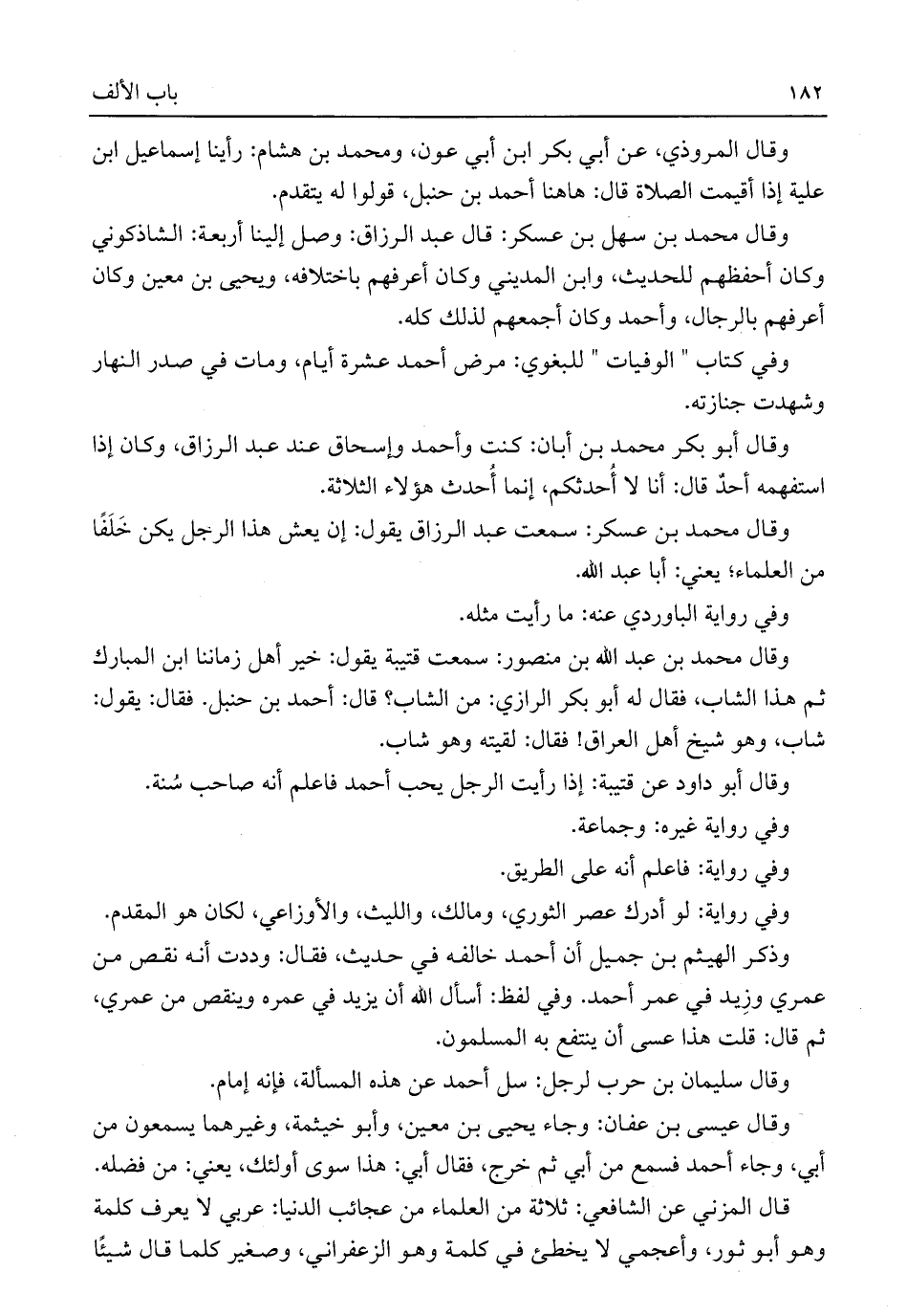 وقال محمد بن عبد اللَّه بن منصور: سمعت قتيبة يقول: خير أهل زماننا ابن المبارك ثم هذا الشاب، فقال له أبو بكر الرازي: من الشاب؟ قال: أحمد بن حنبل. فقال: يقول: شاب، وهو شيخ أهل العراق! فقال: لقيته وهو شاب.