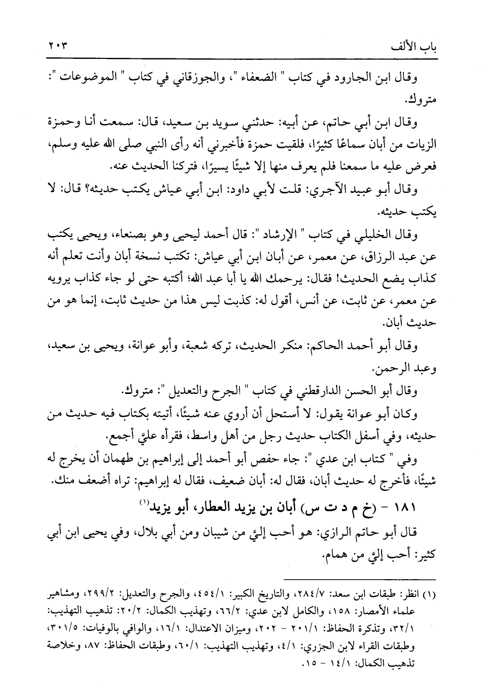 وقال ابن أبي حاتم، عن أبيه: حدثني سويد بن سعيد، قال: سمعت أنا وحمزة الزيات من أبان سماعًا كثيرًا، فلقيت حمزة فأخبرني أنه رأى النبي صلى اللَّه عليه وسلم، فعرض عليه ما سمعنا فلم يعرف منها إلا شيئًا يسيرًا، فتركنا الحديث عنه.