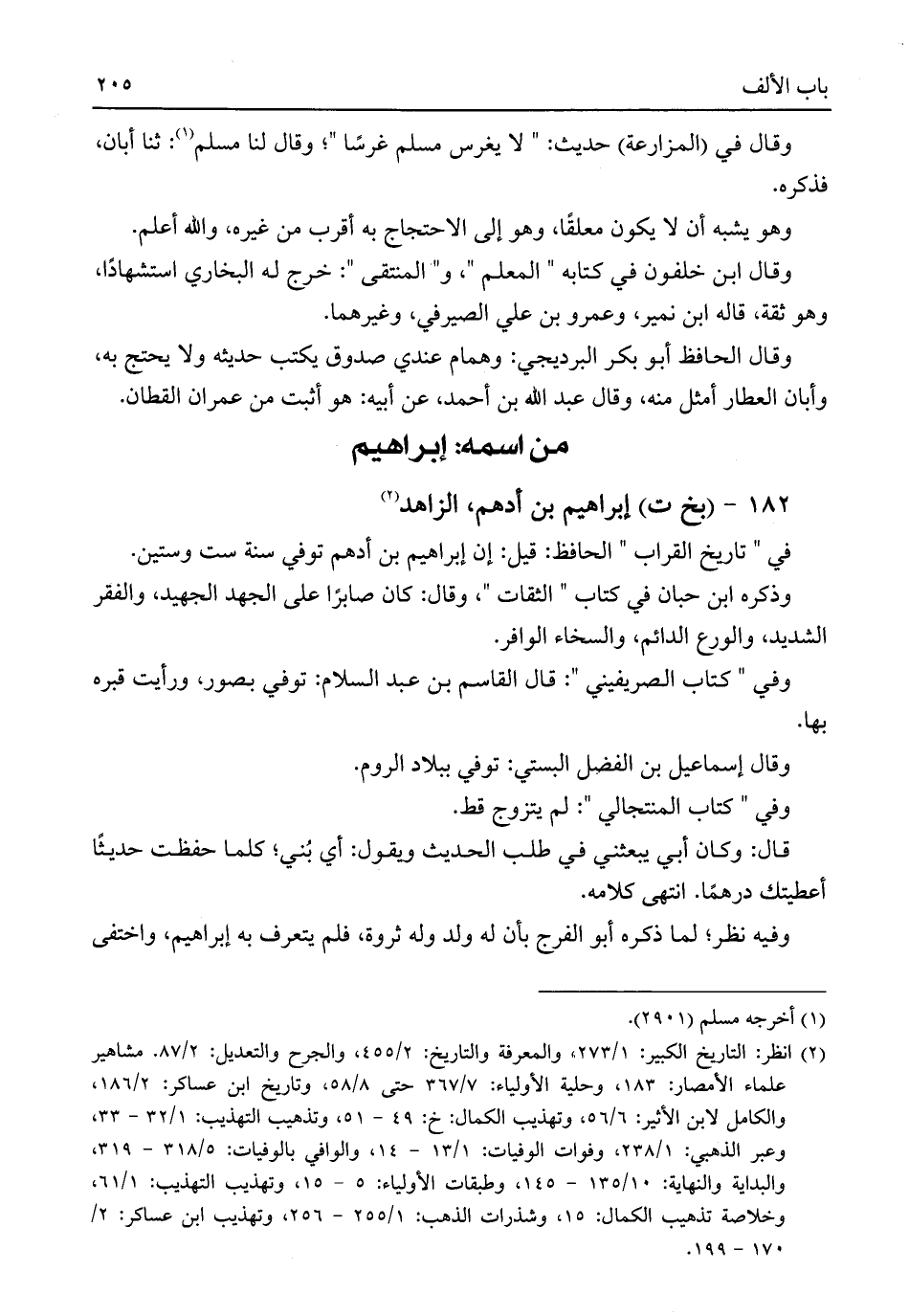(¬٢) انظر: التاريخ الكبير: ١/ ٢٧٣، والمعرفة والتاريخ: ٢/ ٤٥٥، والجرح والتعديل: ٢/ ٨٧. مشاهير علماء الأمصار: ١٨٣، وحلية الأولياء: ٧/ ٣٦٧ حتى ٨/ ٥٨، وتاريخ ابن عساكر: ٢/ ١٨٦، والكامل لابن الأثير: ٦/ ٥٦، وتهذيب الكمال: خ: ٤٩ - ٥١، وتذهيب التهذيب: ١/ ٣٢ - ٣٣، وعبر الذهبي: ١/ ٢٣٨، وفوات الوفيات: ١/ ١٣ - ١٤، والوافي بالوفيات: ٥/ ٣١٨ - ٣١٩، والبداية والنهاية: ١٠/ ١٣٥ - ١٤٥، وطبقات الأولياء: ٥ - ١٥، وتهذيب التهذيب: ١/ ٦١، وخلاصة تذهيب الكمال: ١٥، وشذرات الذهب: ١/ ٢٥٥ - ٢٥٦، وتهذيب ابن عساكر: ٢/ ١٧٠ - ١٩٩.