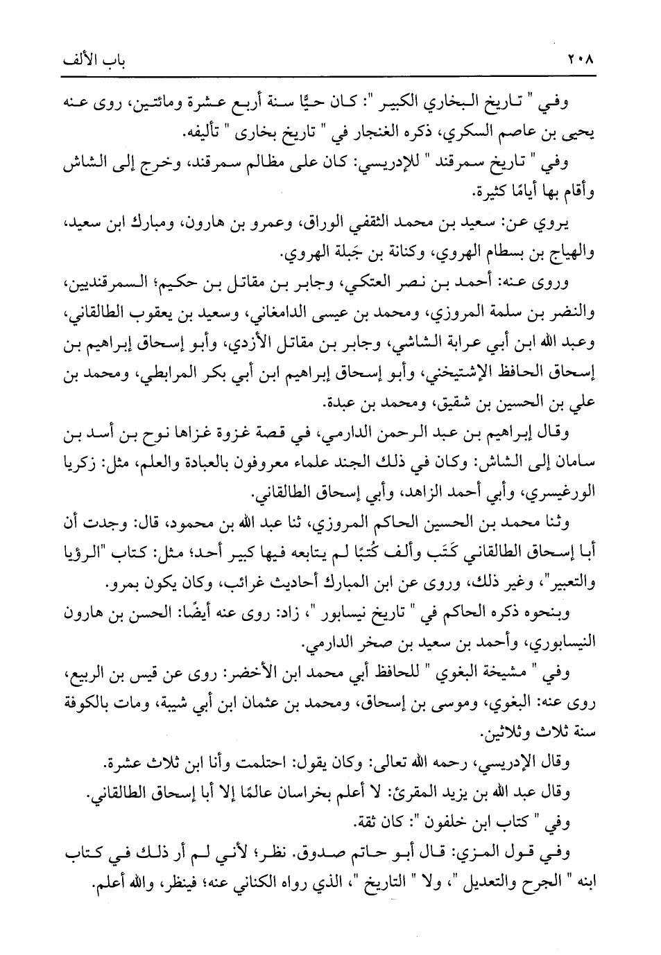 وفي "تاريخ البخاري الكبير": كان حيًّا سنة أربع عشرة ومائتين، روى عنه يحيى بن عاصم السكري، ذكره الغنجار في "تاريخ بخارى" تأليفه.