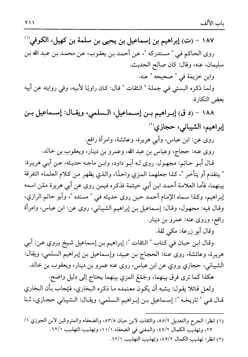(¬١) انظر: الجرح والتعديل ٢/ ٨٥، والثقات لابن حبان ٨/ ٨٣، والضعفاء والمتروكين لابن الجوزي ١/ ٢٣، وتهذيب الكمال ٢/ ٤٧، والمغني في الضعفاء ١/ ١٠، وتهذيب التهذيب ١/ ٦٢.