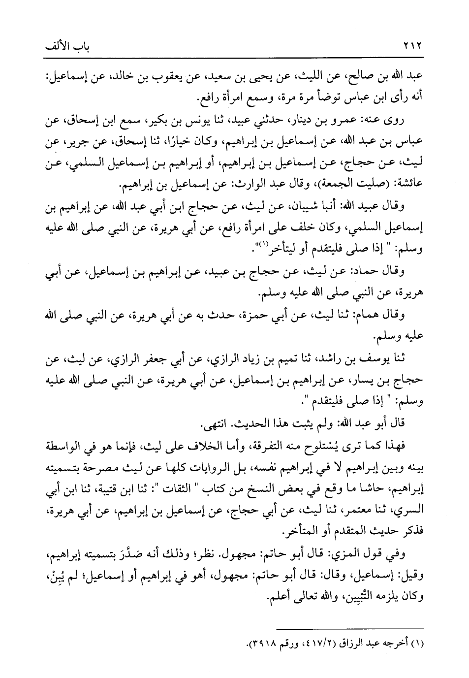فهذا كما ترى يُسْتلوح منه التفرقة، وأما الخلاف على ليث، فإنما هو في الواسطة بينه وبين إبراهيم لا في إبراهيم نفسه، بل الروايات كلها عن ليث مصرحة بتسميته إبراهيم، حاشا ما وقع في بعض النسخ من كتاب "الثقات": ثنا ابن قتيبة، ثنا ابن أبي السري، ثنا معتمر، ثنا ليث، عن أبي حجاج، عن إسماعيل بن إبراهيم، عن أبي هريرة، فذكر حديث المتقدم أو المتأخر.