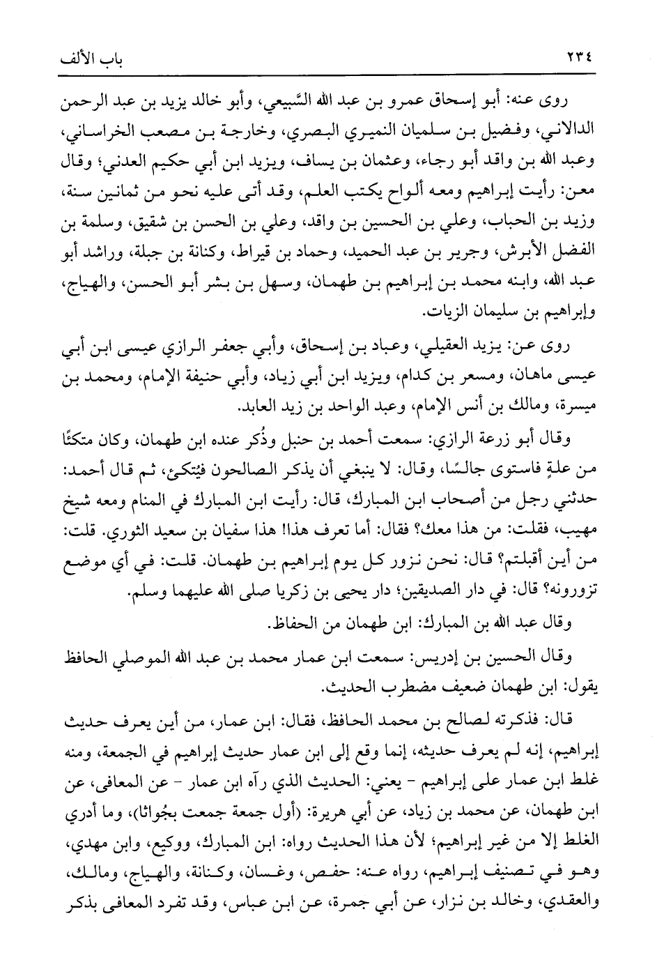 قال: فذكرته لصالح بن محمد الحافظ، فقال: ابن عمار، من أين يعرف حديث إبراهيم، إنه لم يعرف حديثه، إنما وقع إلى ابن عمار حديث إبراهيم في الجمعة، ومنه غلط ابن عمار على إبراهيم -يعني: الحديث الذي رآه ابن عمار- عن المعافى، عن ابن طهمان، عن محمد بن زياد، عن أبي هريرة: (أول جمعة جمعت بجُواثا)، وما أدري الغلط إلا من غير إبراهيم؛ لأن هذا الحديث رواه: ابن المبارك، ووكيع، وابن مهدي، وهو في تصنيف إبراهيم، رواه عنه: حفص، وغسان، وكنانة، والهياج، ومالك، والعقدي، وخالد بن نزار، عن أبي جمرة، عن ابن عباس، وقد تفرد المعافى بذكر