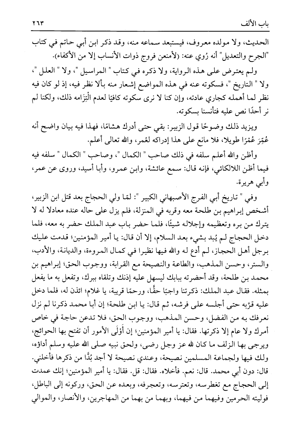 وفي "تاريخ أبي الفرج الأصبهاني الكبير": لمّا ولي الحجاج بعد قتل ابن الزبير، أشخص إبراهيم بن طلحة معه وقربه في المنزلة، فلم يزل على حاله عنده معادلا له لا يترك من بره وتعظيمه وإجلاله شيئًا، فلما حضر باب عبد الملك حضر به معه، فلما دخل الحجاج لم يُبد بشيء بعد السلام، إلا أن قال: يا أمير المؤمنين؛ قدمت عليك برجل أهل الحجاز، لم أدع له واللَّه فيها نظيرا في كمال المروءة، والديانة، والأدب، والستر، وحسن المذهب، والطاعة والنصيحة مع القرابة، ووجوب الحق؛ إبراهيم بن محمد بن طلحة، وقد أحضرته ببابك ليسهل عليه إذنك وتلقاه ببرك، وتفعل به ما يفعل بمثله. فقال عبد الملك: ذكرتنا واجبًا حقًّا، ورحمًا قريبة، يا غلام؛ ائذن له، فلما دخل عليه قرَّبه حتى أجلسه على فرشه، ثم قال: يا ابن طلحة؛ إن أبا محمد ذكرنا لم نزل نعرفك به من الفضل، وحسن المذهب، ووجوب الحق، فلا تدعن حاجة في خاص أمرك ولا عام إلا ذكرتها. فقال: يا أمير المؤمنين؛ إن أَوْلَى الأمور أن تفتح بها الحوائج، ويرجى بها الزلف ما كان للَّه عز وجل رضى، ولحق نبيه صلى اللَّه عليه وسلم أداؤه، ولك فيها ولجماعة المسلمين نصيحة، وعندي نصيحة لا أجد بُدًّا من ذكرها فأخلني. قال: دون أبي محمد. قال: نعم. فأخلاه. فقال: قل. فقال: يا أمير المؤمنين؛ إنك عمدت إلى الحجاج مع تغطرسه، وتعترسه، وتعجرفه، وبعده عن الحق، وركونه إلى الباطل، فوليته الحرمين وفيهما من فيهما، وبهما من بهما من المهاجرين، والأنصار، والموالي