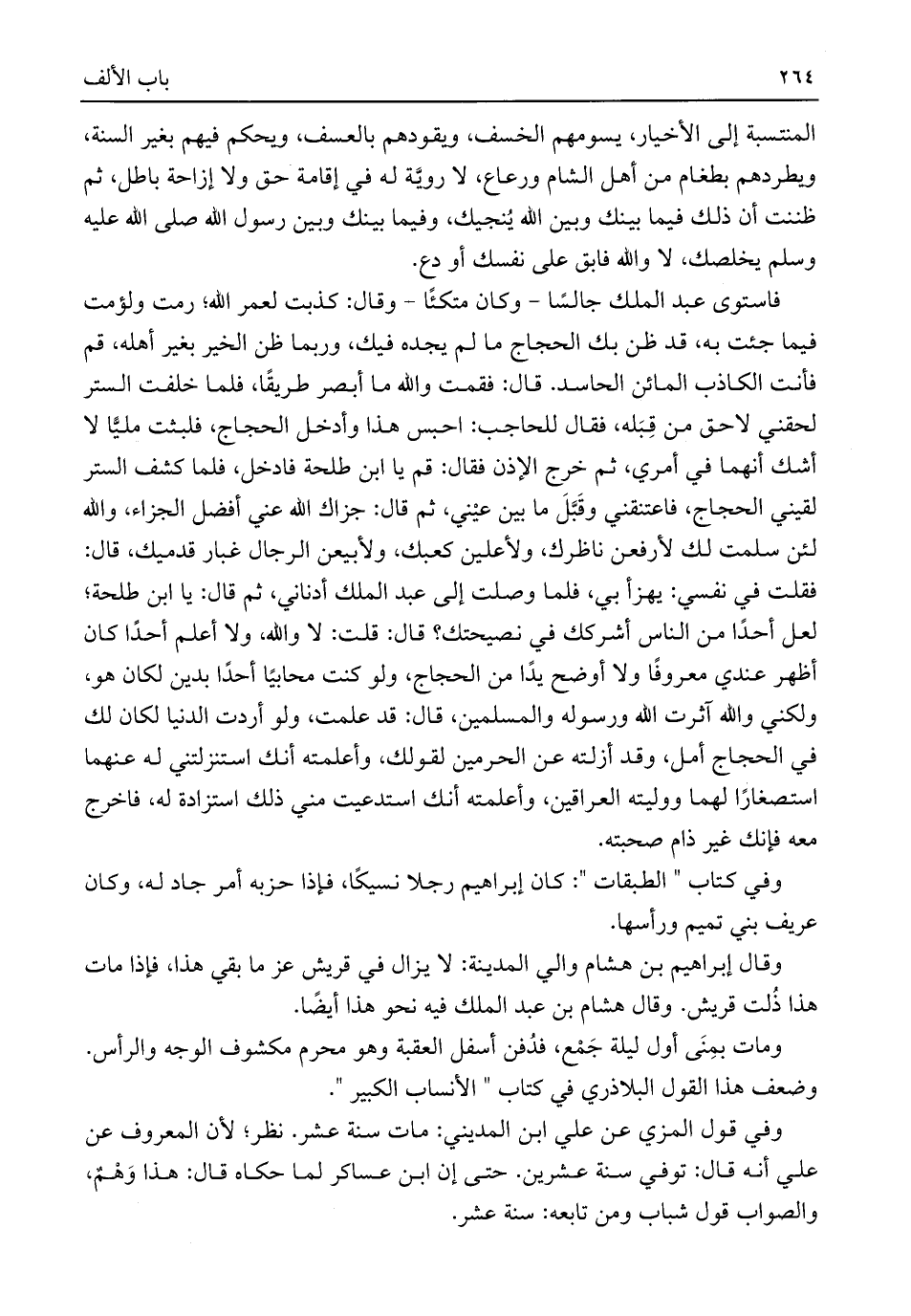 المنتسبة إلى الأخيار، يسومهم الخسف، ويقودهم بالعسف، ويحكم فيهم بغير السنة، ويطردهم بطغام من أهل الشام ورعاع، لا رويَّة له في إقامة حق ولا إزاحة باطل، ثم ظننت أن ذلك فيما بينك وبين اللَّه يُنجيك، وفيما بينك وبين رسول اللَّه صلى اللَّه عليه وسلم يخلصك، لا واللَّه فابق على نفسك أو دع.