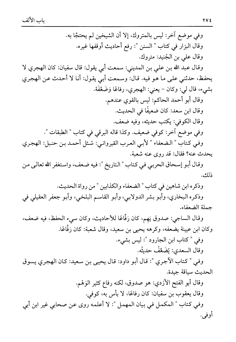 وقال عبد اللَّه بن علي بن المديني: سمعت أبي يقول: قال سفيان: كان الهجري لا يحفظ، حدثني على ما هو فيه. قال: وسمعت أبي يقول: أنا لا أحدث عن الهجري بشيء، قال لي: وكان - يعني: الهجري، رفاعًا وَضَعَّفَهُ.