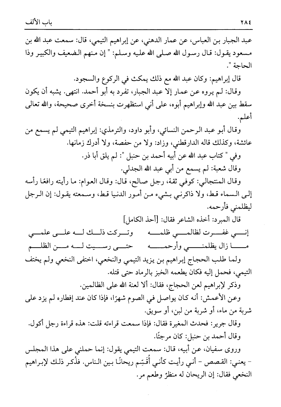 عبد الجبار بن العباس، عن عمار الدهني، عن إبراهيم التيمي، قال: سمعت عبد اللَّه بن مسعود يقول: قال رسول اللَّه صلى اللَّه عليه وسلم: "إن منهم الضعيف والكبير وذا الحاجة".