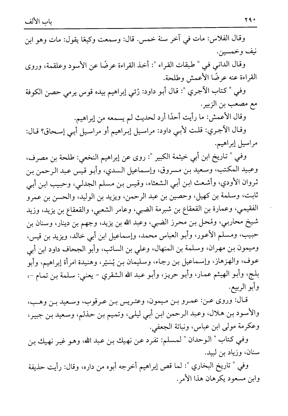 وفي "تاريخ ابن أبي خيثمة الكبير": روى عن إبراهيم النخعي: طلحة بن مصرف، وعبيد المكتب، وسعيد بن مسروق، وإسماعيل السدي، وأبو قيس عبد الرحمن بن ثروان الأودي، وأشعث ابن أبي الشعثاء، وقيس بن مسلم الجدلي، وحبيب ابن أبي ثابت، وسلمة بن كهيل، وحصين بن عبد الرحمن، ويزيد بن الوليد، والحسن بن عمرو الفقيمي، وعمارة بن القعقاع بن شبرمة الضبي، وعامر الشعبي، والقعقاع بن يزيد، وزيد شيخ محاربي، ومُحل بن محرز الضبي، وعبد اللَّه بن يزيد، وجهم بن دينار، وسنان بن حبيب، ومسلم الأعور، وأبو العباس محمد، وإسماعيل ابن أبي خالد، ويزيد بن قيس، وميمون بن مهران، وسلمة بن المنهال، وعلي بن السائب، وأبو الجحاف داود ابن أبي عوف، والهزهاز، وإسماعيل بن رجاء، وسليمان بن يُسَيْر، وهنيدة امرأة إبراهيم، وأبو بلج، وأبو الهيثم عمار، وأبو حريز، وأبو عبد اللَّه الشقري - يعني: سلمة بن تمام، وأبو الربيع.