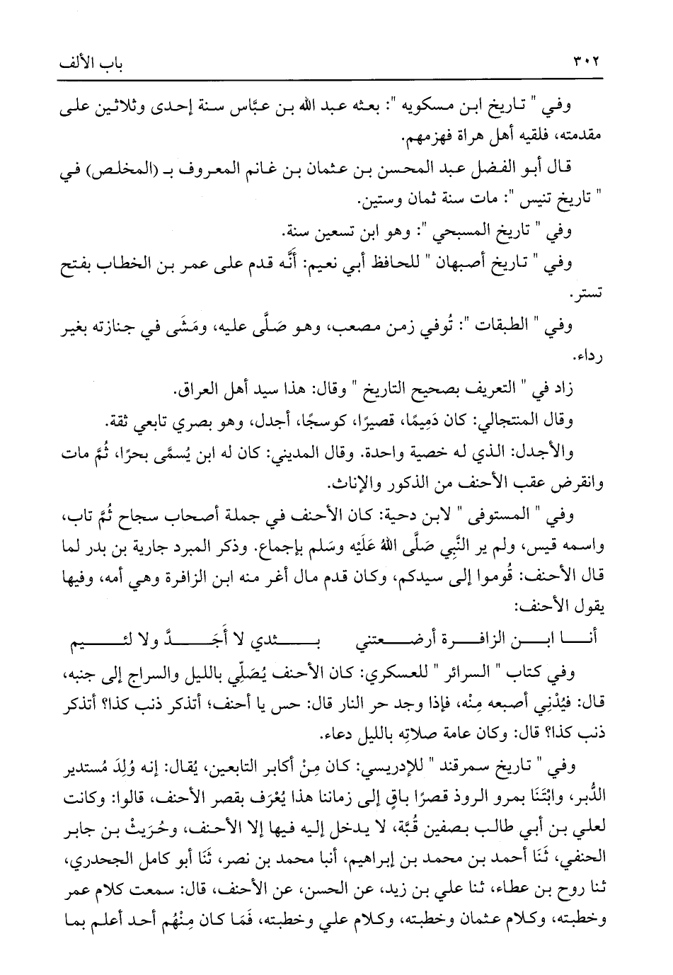 وفي "المستوفى" لابن دحية: كان الأحنف في جملة أصحاب سجاح ثُمَّ تاب، واسمه قيس، ولم ير النَّبِي صَلَّى اللَّهُ عَلَيْه وسَلم بإجماع. وذكر المبرد جارية بن بدر لما قال الأحنف: قُوموا إلى سيدكم، وكان قدم مال أغر منه ابن الزافرة وهي أمه، وفيها يقول الأحنف: