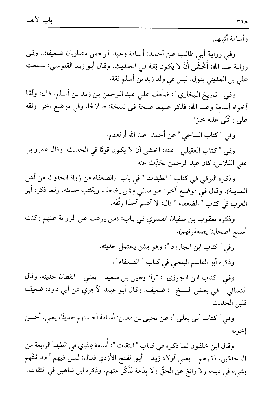 وفي "تاريخ البخاري": ضعفط علي عبد الرحمن بن زيد بن أسلم، قال: وأَمَّا أَخواه أسامة وعبد اللَّه، فذكر عنهما صحة في نسخة: صلاحًا. وفي موضع آخر: وثقه علي وأَثْنَى عليه خيرًا.
