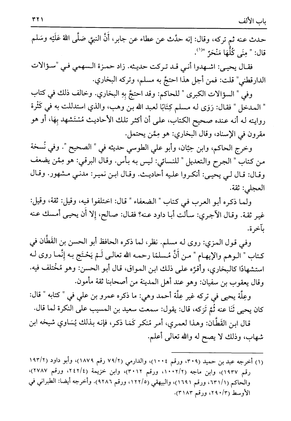 فقال يحيى: اشهدوا أني قد تركت حديثه. زاد حمزة السهمي في "سؤالات الدارقطني" قلت: فمن أجل هذا احتجَّ به مسلم، وتركه البخاري.
