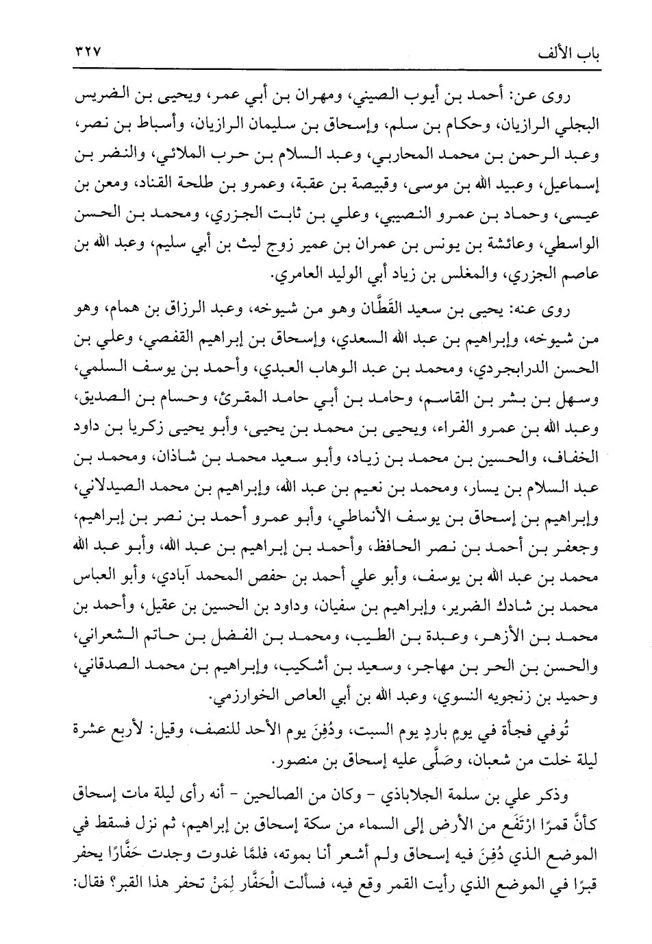 وذكر علي بن سلمة الجلاباذي -وكان من الصالحين- أنه رأى ليلة مات إسحاق كأنَّ قمرًا رْتَفَع من الأرض إلى السماء من سكة إسحاق بن إبراهيم، ثم نزل فسقط في الموضع الذي دُفِنَ فيه إسحاق ولم أشعر أنا بموته، فلمَّا غدوت وجدت حَفَّارًا يحفر قبرًا في الموضع الذي رأيت القمر وقع فيه، فسألت الْحَفَّار لِمَنْ تحفر هذا القبر؟ فقال: