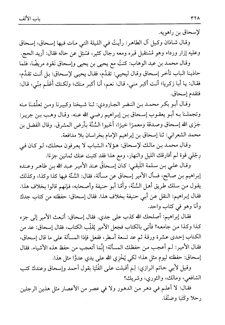 وقال علي بن سلمة اللَبقي: كان إسحاقُ عند الأمير عبد اللَّه بن طاهر وعنده إبراهيم بن صالح، فسأل الأمير إسحاق عن مسألة، فقال: السُّنَّة فيها كذا وكذا، وكذلك يقول من سلك طريق أهل السُّنَّة، وأَمَّا أبو حنيفة وأصحابه، فإنهم قالوا بخلاف هذا. فقال إبراهيم: النقل عن أبي حنيفة بخلاف هذا. فقال إسحاق: حفظته من كتاب جدك وأنا وهو في كتاب واحد.