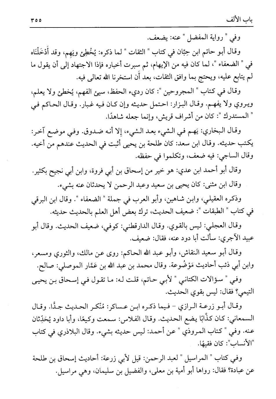 وقال أبو حاتم ابن حِبَّان في كتاب "الثقات" لما ذكره: يُخْطِئ ويَهِم، وقد أَدْخَلْنَاه في "الضعفاء"، لما كان فيه من الإيهام، ثم سبرت أخباره فإذا الاجتهاد إلى أن يقول ما لم يتابع عليه، ويحتج بما وافق الثقات، بعد أَن استخرنا اللَّه تعالى فيه.