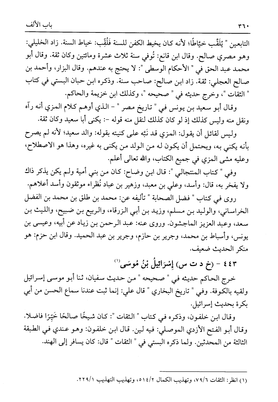 التابعين" يُلَقَّب خيَّاطًا؛ لأنه كان يخيط الكفن للسنة فَلُقِّب: خياط السنة. زاد الخليلي: وهو مصري صالح. وقال ابن قانع: تُوفي سنة ثلاث عشرة ومائتين وكان ثقة. وقال أبو محمد عبد الحق في "الأحكام الوسطى": لا يحتج به عندهم. وقال البزار، وأحمد بن صالح العجلي: ثقة. زاد ابن صالح: صاحب سنة. وذكره ابن حبان البستي في كتاب "الثقات"، وخرج حديثه في "صحيحه"، وكذلك ابن خزيمة والحاكم.