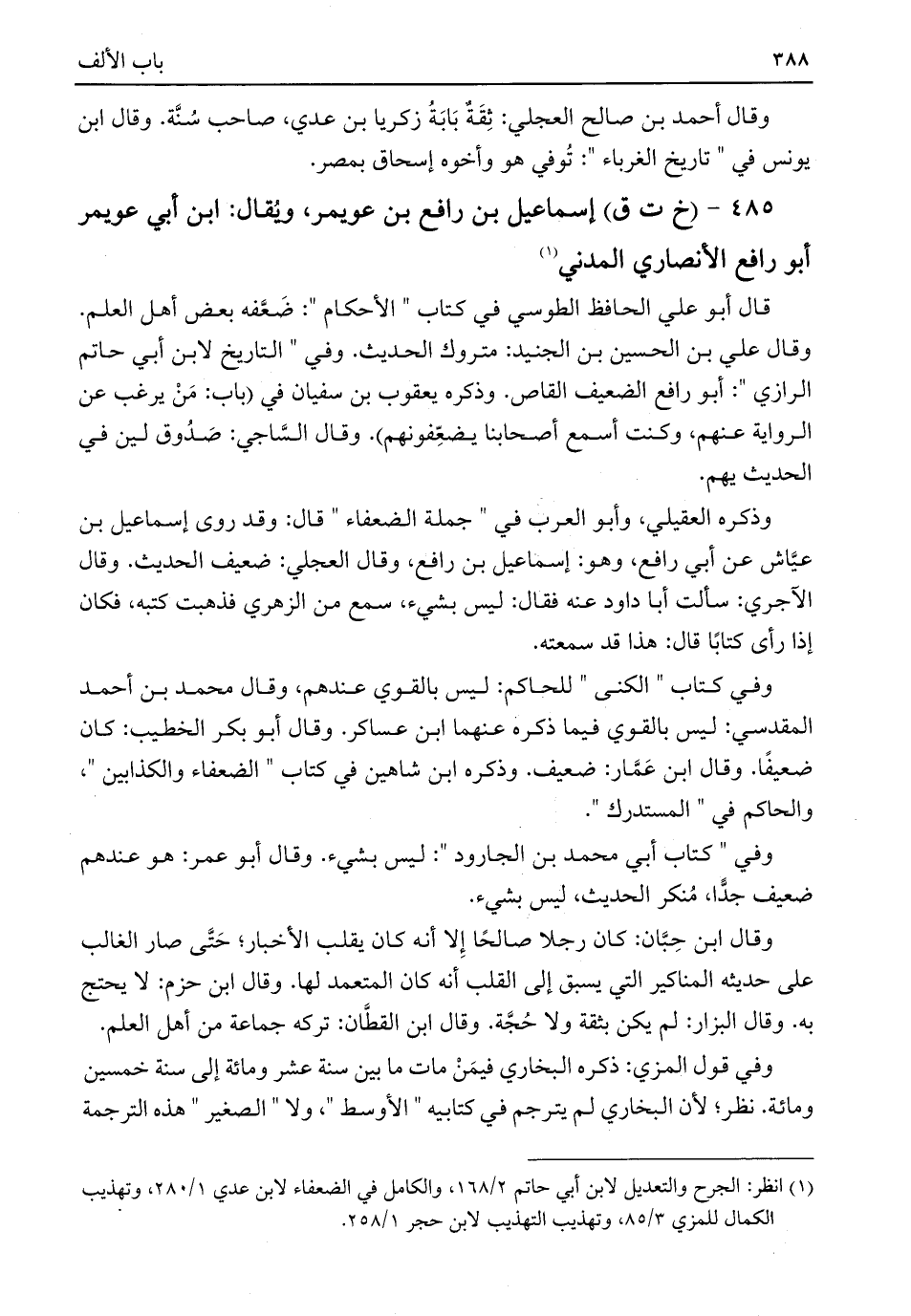 (¬١) انظر: الجرح والتعديل لابن أبي حاتم ٢/ ١٦٨، والكامل في الضعفاء لابن عدي ١/ ٢٨٠، وتهذيب الكمال للمزي ٣/ ٨٥، وتهذيب التهذيب لابن حجر ١/ ٢٥٨.