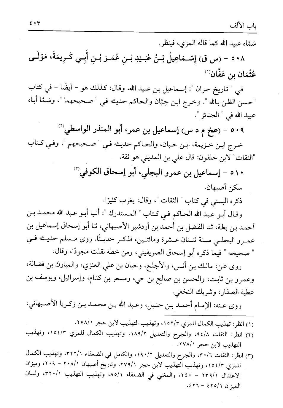 (¬٣) انظر: الثقات ٦/ ٣٠، والجرح والتعديل ٢/ ١٩٠، والكامل في الضعفاء ١/ ٣٢٢، وتهذيب الكمال للمزي ٣/ ١٥٤، وتهذيب التهذيب لابن حجر ١/ ٢٧٩، وتاريخ أصبهان ١/ ٢٠٨ - ٢٠٩، وميزان الاعتدال ١/ ٢٣٩ - ٢٤٠، والمغني في الضعفاء ١/ ٨٥، وتهذيب التهذيب ١/ ٣٢٠، ولسان الميزان ١/ ٤٢٥ - ٤٢٦.