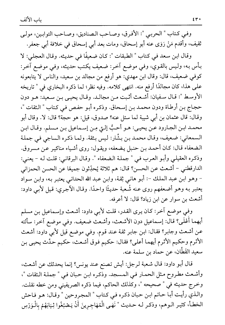 وفي موضع آخر: كان يرى القدر، قلت لأبي داود: أشعث وإسماعيل بن مسلم أيهما أَعْلَى؟ قال: إسماعيل دون الأشعث، وأشعث ضعيف. وفي موضع آخر: سألته عن أشعث وجابر؟ فقال: ابن جابر ثقة عند قوم. وفي موضع قيل لأبي داود: أشعث الأثرم وحكيم الأثرم أيهما أعلى؟ فقال: حكيم فوق أشعث، حكيم حدَّث يحيى بن سعيد القَطَّان، عن حماد بن سلمة عنه.