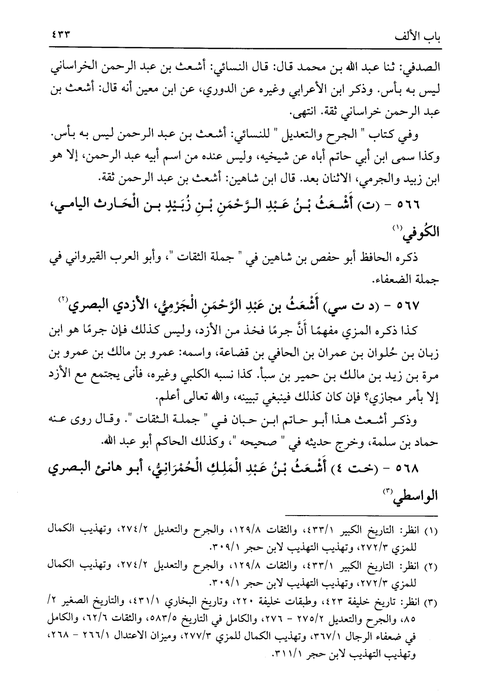 وفي كتاب "الجرح والتعديل" للنسائي: أشعث بن عبد الرحمن ليس به بأس. وكذا سمى ابن أبي حاتم أباه عن شيخيه، وليس عنده من اسم أبيه عبد الرحمن، إلا هو ابن زبيد والجرمي، الاثنان بعد. قال ابن شاهين: أشعث بن عبد الرحمن ثقة.