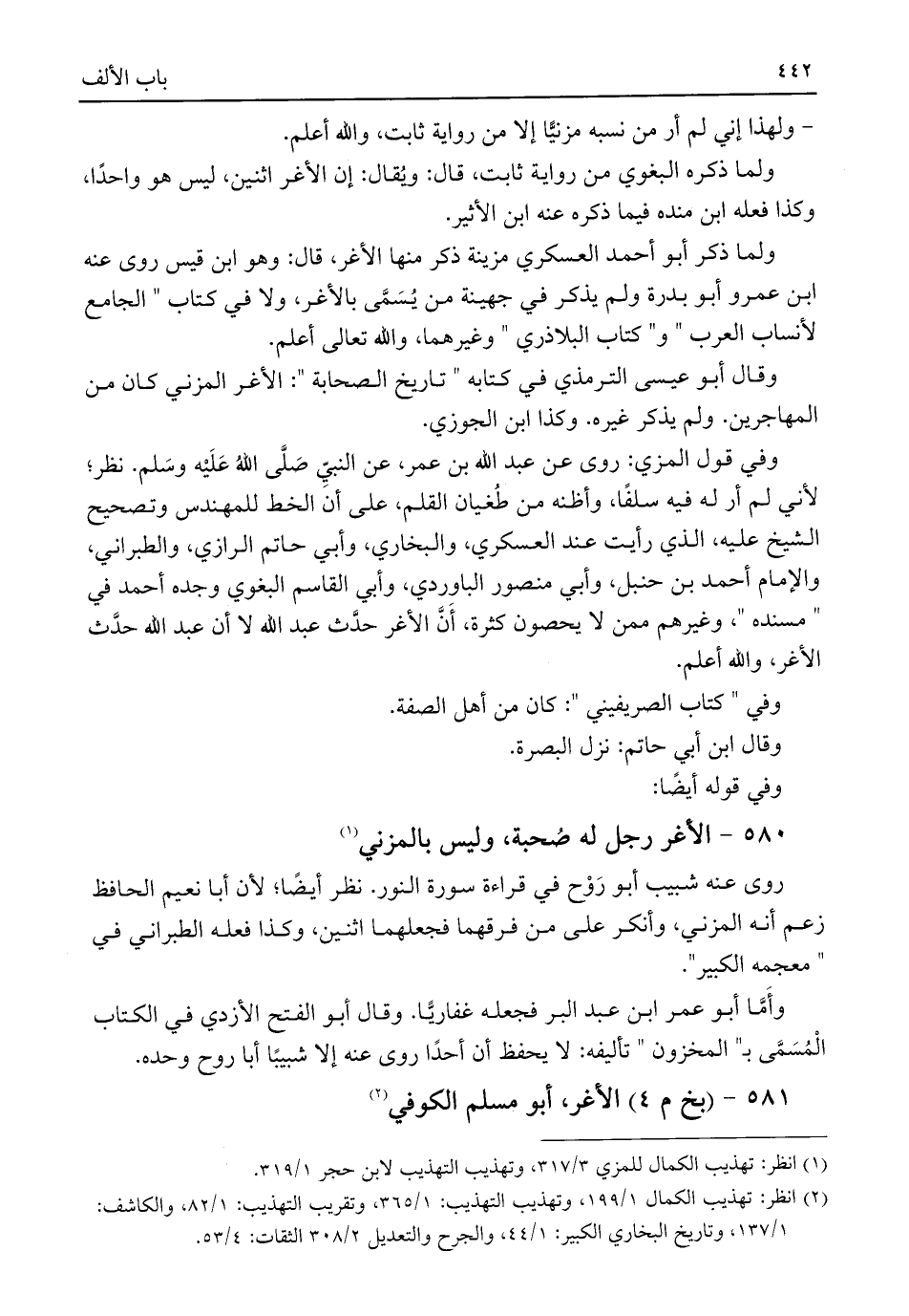 وفي قول المزي: روى عن عبد اللَّه بن عمر، عن النبيِّ صَلَّى اللَّهُ عَلَيْه وسَلم. نظر؛ لأني لم أر له فيه سلفًا، وأظنه من طُغيان القلم، على أن الخط للمهندس وتصحيح الشيخ عليه، الذي رأيت عند العسكري، والبخاري، وأبي حاتم الرازي، والطبراني، والإمام أحمد بن حنبل، وأبي منصور الباوردي، وأبي القاسم البغوي وجده أحمد في "مسنده"، وغيرهم ممن لا يحصون كثرة، أَنَّ الأغر حدَّث عبد اللَّه لا أن عبد اللَّه حدَّث الأغر، واللَّه أعلم.