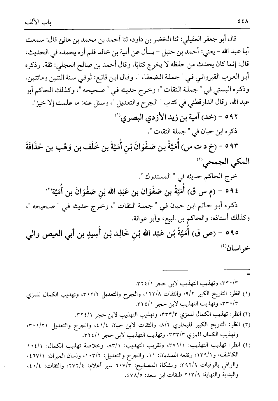 قال أبو جعفر العقيلي: ثنا الخضر بن داود، ثنا أحمد بن محمد بن هانئ قال: سمعت أبا عبد اللَّه -يعني: أحمد بن حنبل- يسأل عن أمية بن خالد فلم أره يحمده في الحديث، قال: إنما كان يحدث من حفظه لا يخرج كتابًا. وقال أحمد بن صالح العجلي: ثقة. وذكره أبو العرب القيرواني في "جملة الضعفاء". وقال ابن قانع: تُوفي سنة اثنتين ومائتين. وذكره البستي في "جملة الثقات"، وخرج حديثه في "صحيحه"، وكذلك الحاكم أبو عبد اللَّه. وقال الدارقطني في كتاب "الجرح والتعديل"، وسئل عنه: ما علمت إلا خيرًا.