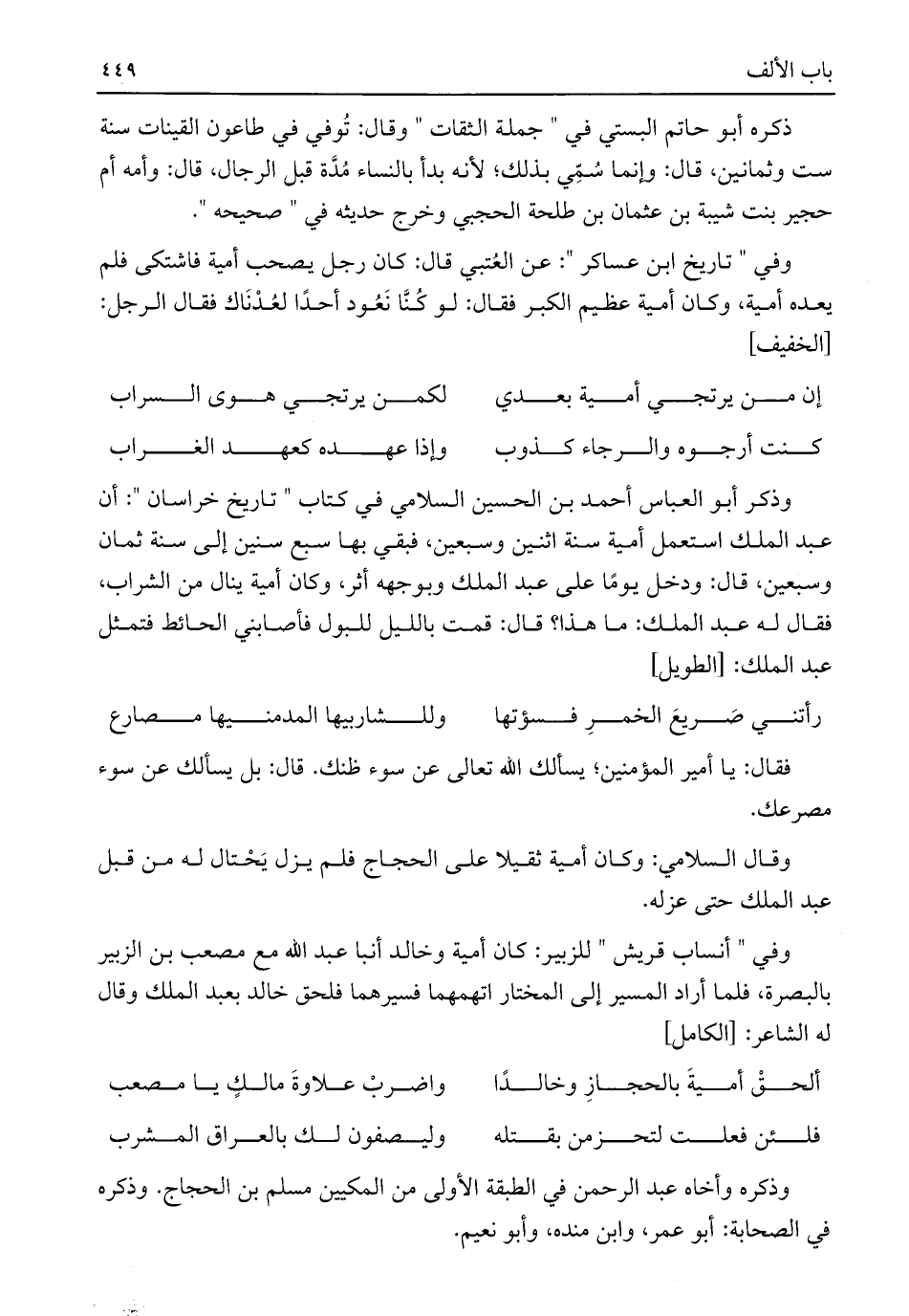 وفي "أنساب قريش" للزبير: كان أمية وخالد أنبا عبد اللَّه مع مصعب بن الزبير بالبصرة، فلما أراد المسير إلى المختار اتهمهما فسيرهما فلحق خالد بعبد الملك وقال له الشاعر: [الكامل]