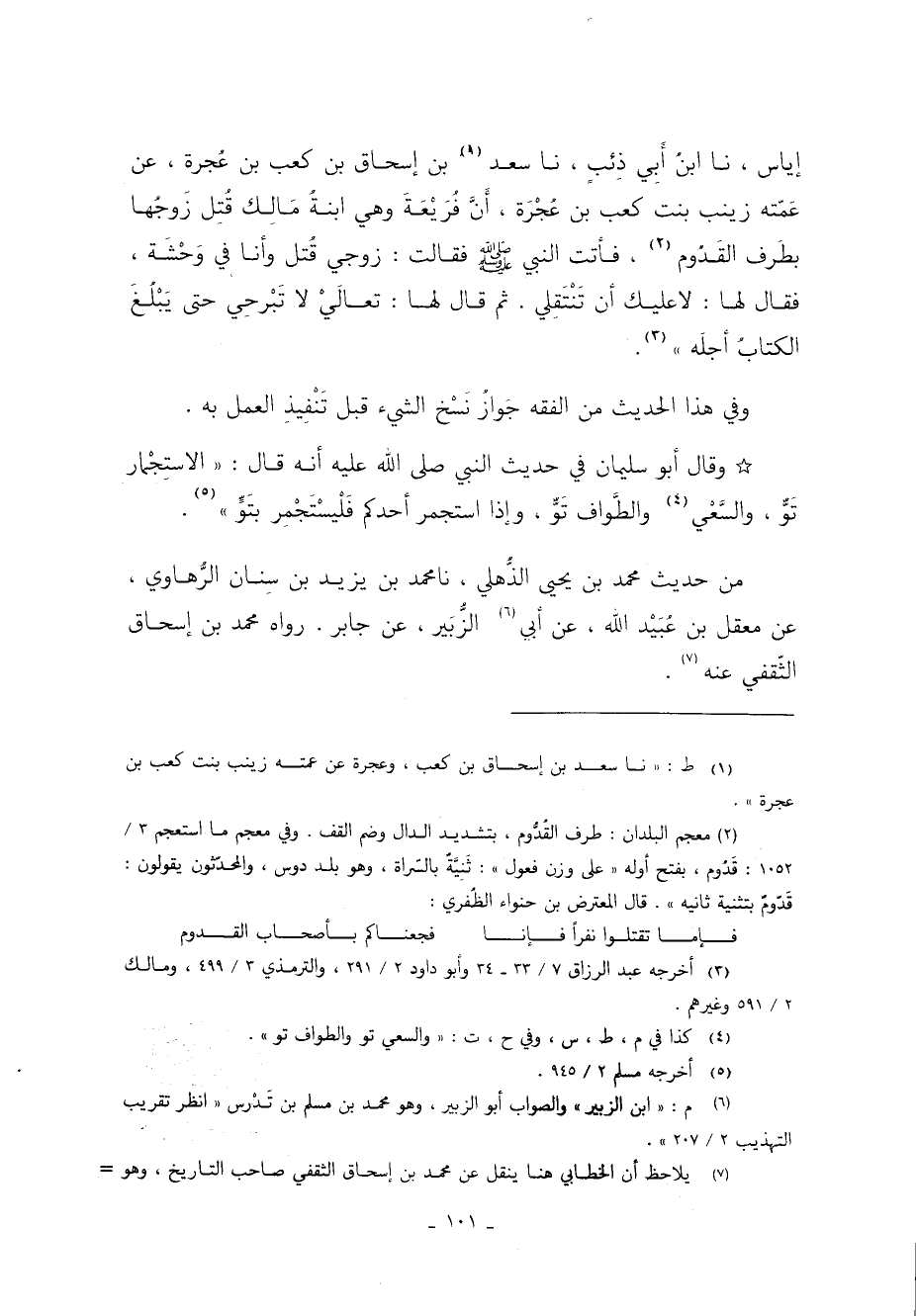 إِيَاسٍ نا ابْنُ أَبِي ذِئْبٍ نا سَعْدُ 1 بْنُ إِسْحَاقَ بْنِ كَعْبِ بْنِ عُجْرَةَ عَنْ عَمَّتِهِ زَيْنَبَ بِنْتِ كَعْبِ بْنِ عُجْرَةَ أَنَّ فُرَيْعَةَ وَهِيَ ابْنَةُ مَالِكٍ قُتِلَ زَوْجُهَا بِطَرَفَ الْقَدُومِ 2 فَأَتَتِ النَّبِيِّ صَلَّى اللَّهُ عَلَيْهِ وَسَلَّمَ فَقَالَتْ: زَوْجِي قُتِلَ وَأَنَا فِي وَحْشَةٍ: "فَقَالَ لَهَا لا عَلَيْكِ أَنْ تَنْتَقِلِي" ثُمَّ قَالَ لَهَا: " تعالي لا تبرحي حتى يبلع الْكِتَابُ أَجَلَهُ" 3.