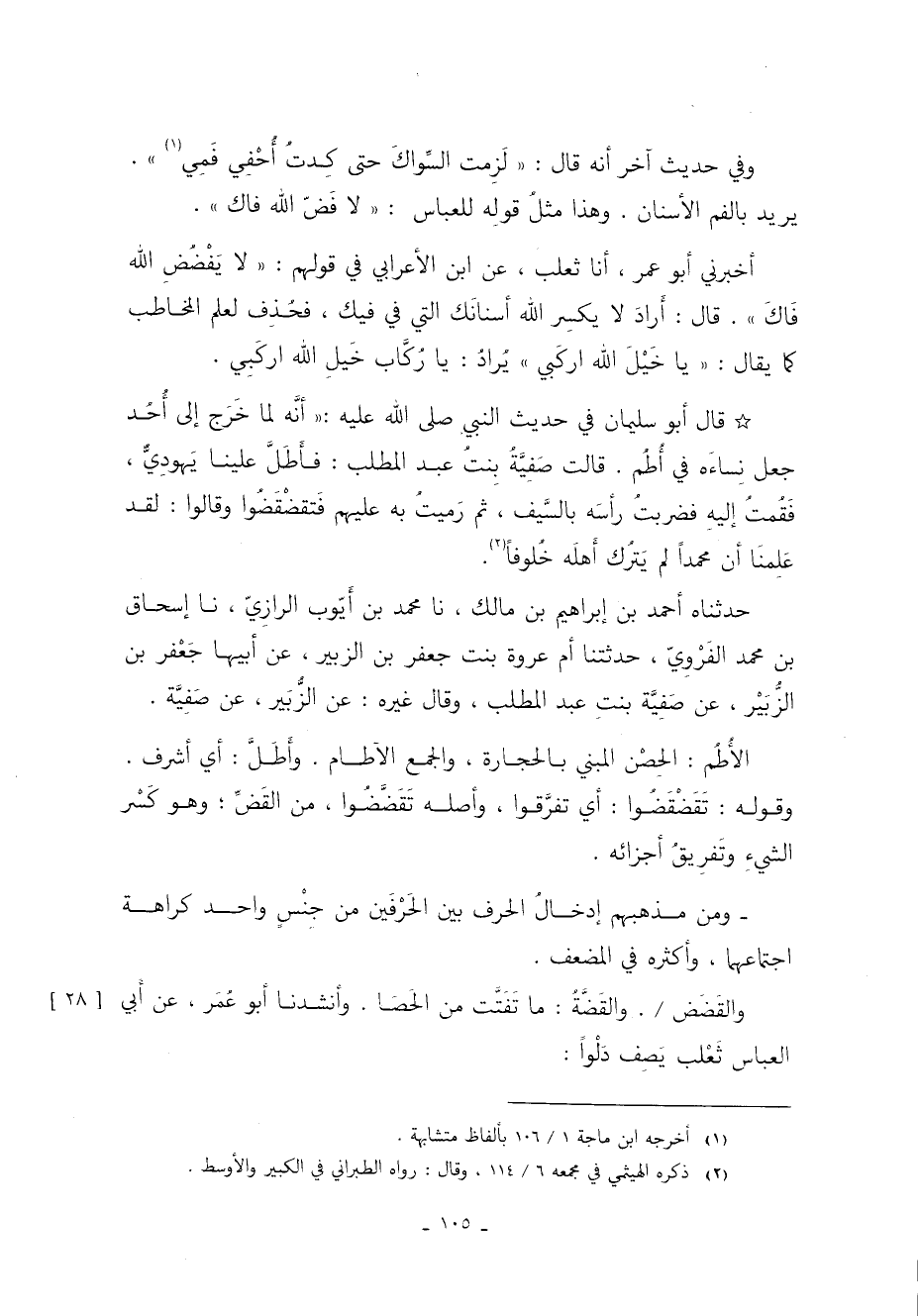 وَفِي حَدِيثٍ آخَرَ أَنَّهُ قَالَ: "لَزِمْتُ السِّوَاكَ حَتَّى كِدْتُ أُحْفِي فَمِي 1" يريد بالفم الأسنان. وهذا مثلُ قولِه للعباس: "لا فَضّ الله فاك".