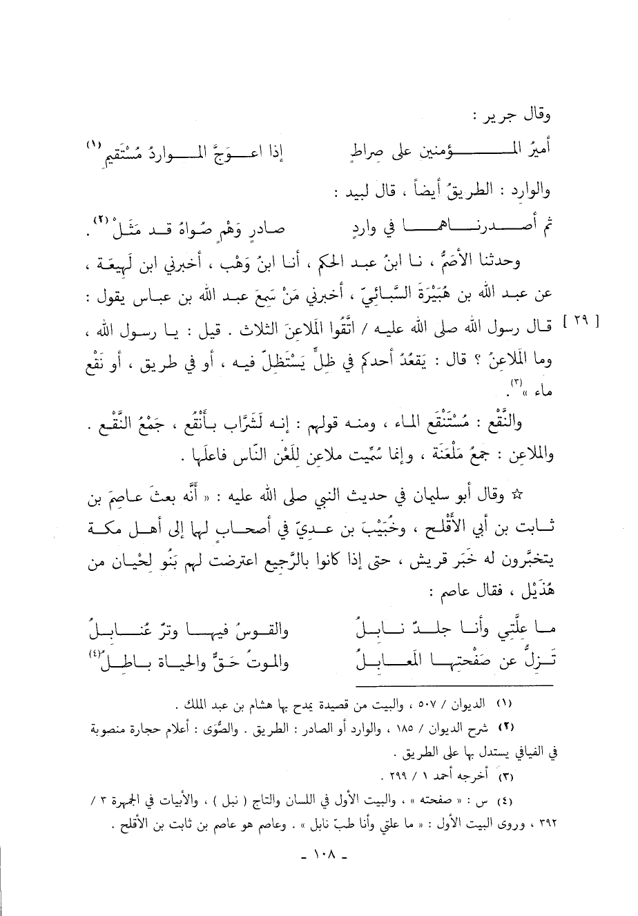 4 س: "صفحة", والبيت الول في اللسان والتاج "نبل", والأبيات في الجمهرة 3/ 392, وروى البيت الول: "ما علتي وأنا طب نابل". وعاصم هو عاصم بن ثابت بن الأقلح.