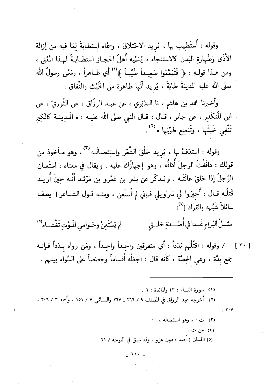 وقوله: أَسَتطِيب بها يُرِيد الاحْتلاقَ وسمَّاه استطابةً لِمَا فيه من إزالة الأَذَى وطَهارةِ البَدَن كالاستِنجاء يُسَمِّيه أَهلُ الحجاز استطابةً لهذا المَعْنى ومن هذا قوله: {فَتَيَمَّمُوا صَعِيدًا طَيِّبًا} 1 أي طاهرًا وسَمَّى رَسُولُ الله صَلَّى اللَّهُ عَلَيْهِ وَسَلَّمَ المدينَة طابَةً يُرِيد أنّها طاهرة من الخُبْثِ والنِّفاق