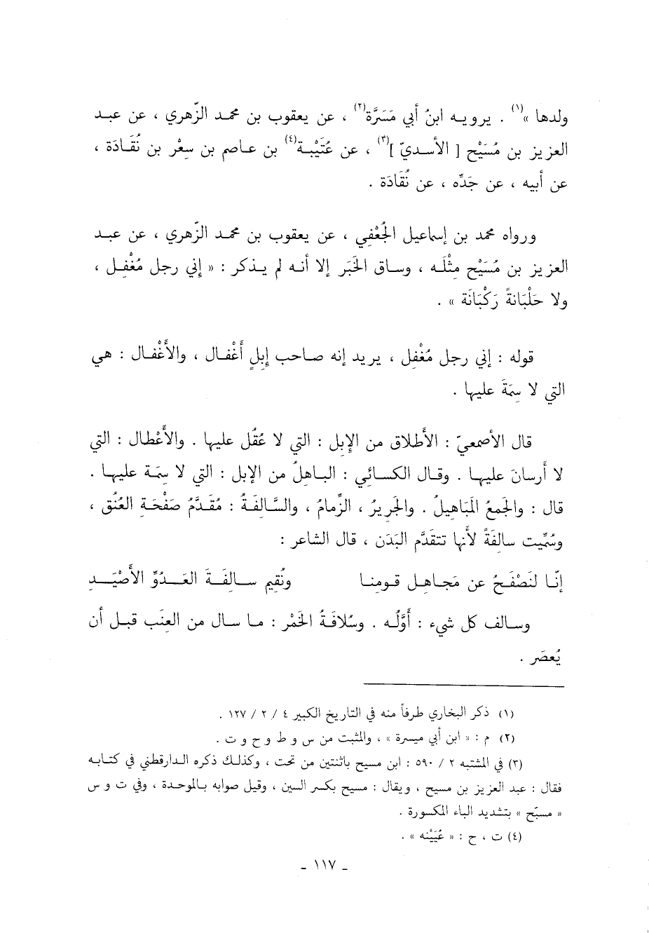 وَرَوَاهُ مُحَمَّدُ بْنُ إِسْمَاعِيلَ الْجُعْفِيُّ عَنْ يَعْقُوبَ بْنِ مُحَمَّدٍ الزُّهْرِيِّ عَنْ عَبْدِ الْعَزِيزِ بْنِ مسيح مِثْلَهُ وَسَاقَ الْخَبَرَ إِلا أَنَّهُ ل"م يَذْكُرْ إِنِّي رَجُلٌ مُغْفِلٌ وَلا حَلْبَانةً رَكْبَانَةً".