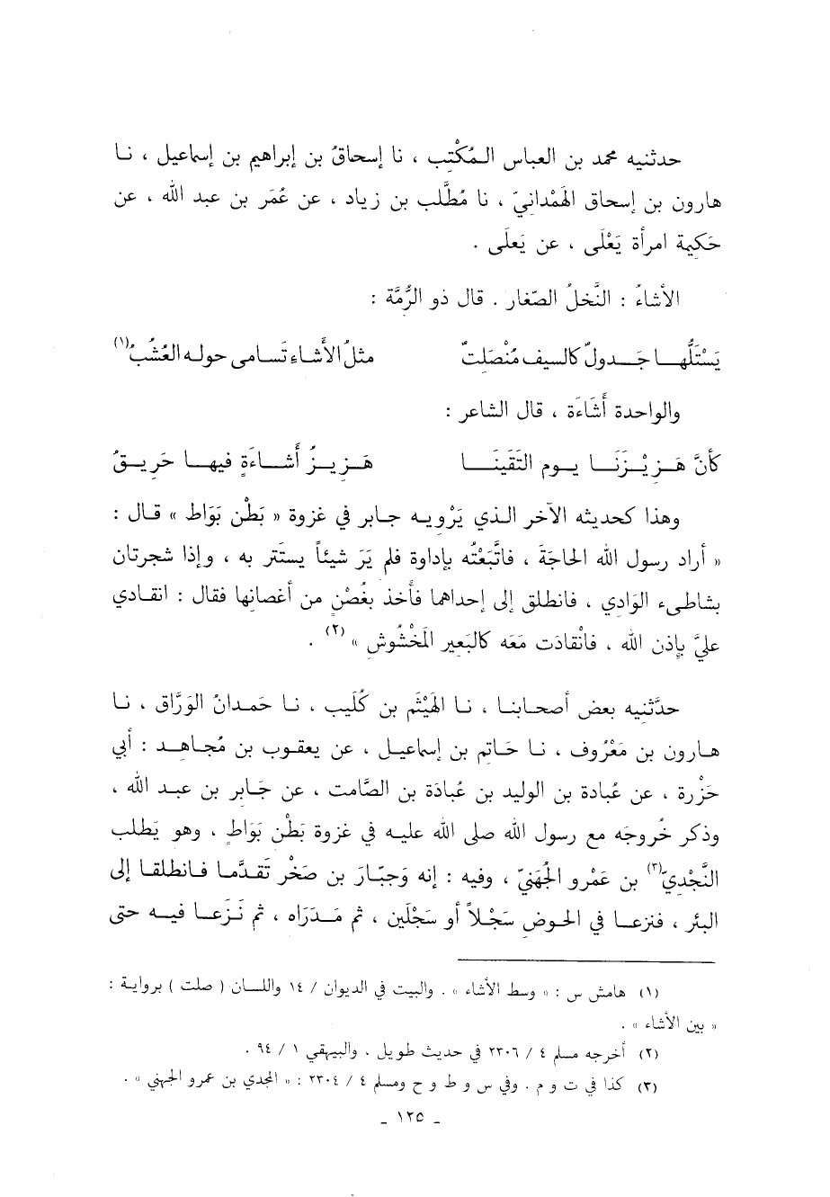 حَدَّثَنِيهِ بَعْضُ أَصْحَابِنَا نا الْهَيْثَمُ بْنُ كُلَيْبٍ نا حَمْدَانُ الْوَرَّاقُ نا هَارُونُ بْنُ مَعْرُوفٍ نا حَاتِمُ بْنُ إِسْمَاعِيلَ عَنْ يَعْقُوبَ بْنِ مُجَاهِدٍ أَبِي حَزْرَةَ عَنْ عُبَادَةَ بْنِ الْوَلِيدِ بْنِ عُبَادَةَ بْنِ الصَّامِتِ عَنْ جَابِرِ بْنِ عَبْدِ اللَّهِ وَذَكَرَ خُرُوجَهُ مَعَ رَسُولِ اللَّهِ صَلَّى اللَّهُ عَلَيْهِ وَسَلَّمَ فِي غَزْوَةِ بَطْنِ بَوَاطٍ وَهُوَ يَطْلُبُ النَّجْدِيَّ 3 بْنَ عَمْرٍو الْجُهَنِيَّ وَفِيهِ إِنَّهُ وَجَبَّارُ بْنُ صَخْرٍ تَقَدَّمَا فَانْطَلَقَا إِلَى الْبِئْرِ فَنَزَعَا فِي الْحَوْضِ سَجْلا أَوْ سَجْلَيْنِ ثُمَّ مَدَرَاهُ ثم نزعا فيه حتى