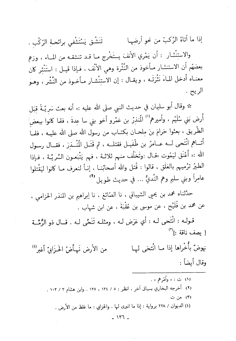 وَقَالَ أَبُو سُلَيْمَانَ فِي حَدِيثِ النَّبِيِّ صَلَّى اللَّهُ عَلَيْهِ وَسَلَّمَ: "أَنَّهُ بَعَثَ سَرِيَّةً قِبَلَ أَرْضِ بَنِي سُلَيْمٍ وَأَمِيرُهُمُ 1 الْمُنْذِرُ بْنُ عَمْرٍو أَخُو بَنِي سَاعِدَةَ فَلَمَّا كَانُوا بِبَعْضِ الطَّرِيقِ بَعَثُوا حَرَامَ بْنَ مِلْحَانَ بِكِتَابٍ مِنْ رَسُولِ اللَّهِ صَلَّى اللَّهُ عَلَيْهِ وَسَلَّمَ فَلَمَّا أَتَاهُمُ انْتَحَى لَهُ عَامِرُ بْنُ طُفَيْلٍ فَقَتَلَهُ ثُمَّ قَتَلَ الْمُنْذِرَ فَقَالَ رَسُولُ اللَّهِ "أَعْنَقَ لِيَمُوتَ" قَالَ: وَتَخَلَّفَ مِنْهُمْ ثَلاثَةٌ فَهُمْ يَتْبَعُونَ السَّرِيَّةَ فَإِذَا الطَّيْرُ ترميهم بالعلف قَالُوا: قُتِلَ وَاللَّهِ أَصْحَابُنَا إِنَّا لَنَعْرِفُ مَا كَانُوا لِيَقْتُلُوا عَامِرًا وَبَنِي سُلَيْمٍ وَهُمُ النَّدِيُّ ... فِي حَدِيثٍ طَوِيلٍ 2