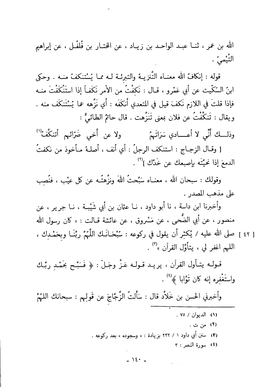 قَوْلُهُ: إِنْكَافُ اللَّهِ مَعْنَاهُ التَّنْزِيهُ وَالتَّبْرِئَةُ لَهُ مِمَّا يُسْتَنْكَفُ مِنْهُ وحكى ابن السّكّيت عن أبي عَمْرو قَالَ نَكِفْتُ من الأمر نَكَفًا إذا استَنْكَفْتَ منه فإذا قلتَ في اللازم نَكفَ قيل في المتعدي أَنكَفَه أَي نَزَّهه عما يُسْتَنكَف منه ويقال تَنكَّفْتُ عن فلان بمعنى تَنَزَّهت قَالَ حاتمٌ الطائيُّ: