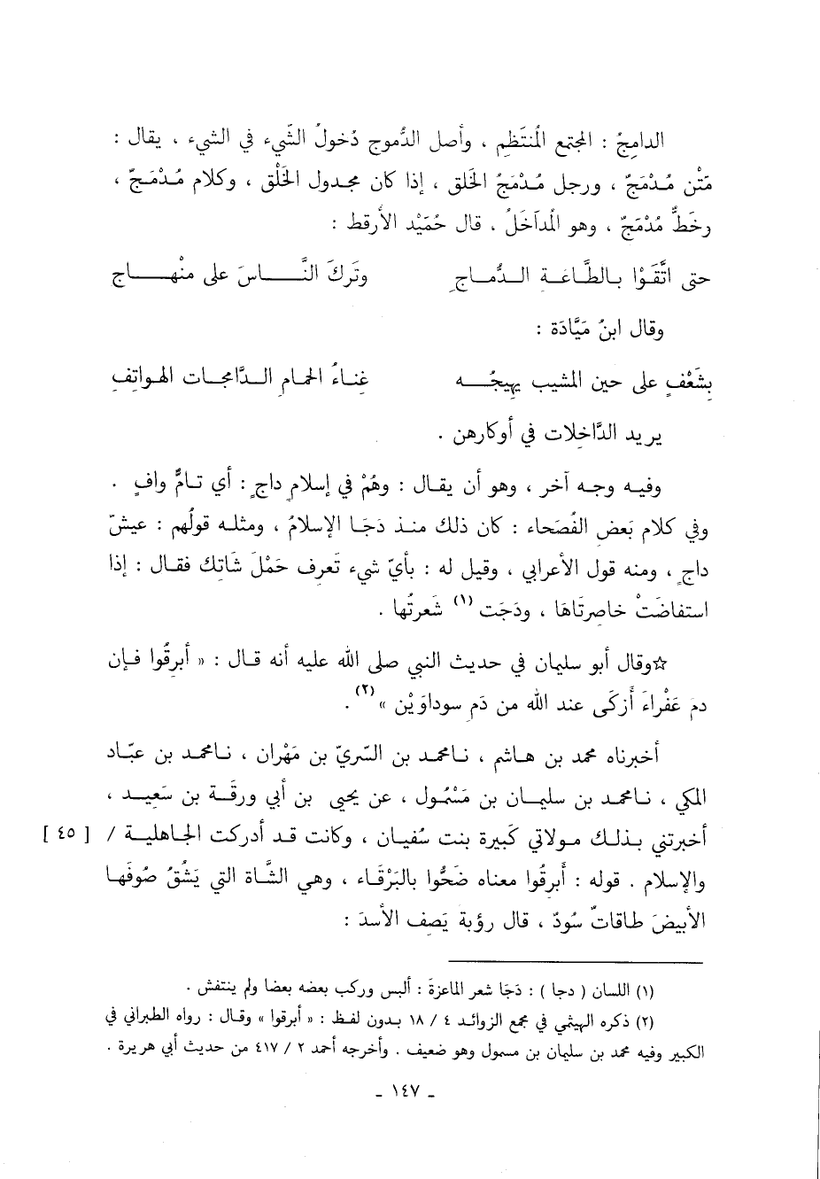 1 اللسان "دجا": دجا شعر الماعزة: ألبس وركب بعضه بعضا ولم ينتفش.