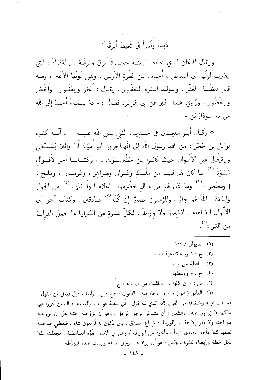 قَالَ أَبُو سُلَيْمَانَ فِي حَدِيثِ النَّبِيِّ صَلَّى اللَّهُ عَلَيْهِ وَسَلَّمَ: أَنَّهُ كَتَبَ لِوَائِلِ بْنِ حُجْرٍ مِنْ مُحَمَّدٍ رَسُولِ اللَّهِ إِلَى المهاجر بن أبو أُمَيَّةَ أَنَّ وَائِلا يُسْتَسْعَى وَيَتَرَفَّلُ عَلَى الأَقْوَالِ حَيْثُ كَانُوا مِنْ حَضْرَمَوْتَ وَكِتَابًا آخَرَ لأَقْوَالِ شَبْوَةَ 1 بِمَا كَانَ لَهُمْ فِيهَا مِنْ مُلْكٍ وَعُمْرَانٍ وَمَزاهِرَ وَعُرمَانَ وَمِلْحٍ وَمَحْجِرٍ 2 وَمَا كَانَ لَهُمْ مِنْ مَالٍ بِحَضْرمَوْتَ أَعْلاهَا وَأَسْفَلِهَا 3 مِنَ الْجِوَارِ وَالذَّمَّةِ اللَّهُ لَهُمْ جَارٌ وَالْمُؤْمِنُونَ أَنْصَارٌ إِنْ كُنَّا 4 صَادِقِينَ وَكِتَابًا آخَرَ إِلَى الأَقْوَالِ الْعَبَاهِلَةِ لا شِغَارَ وَلا وِرَاطَ لِكُلِّ عَشَرَةٍ مِنَ السَّرَايَا مَا يَحْمِلُ القراب من التمر"5