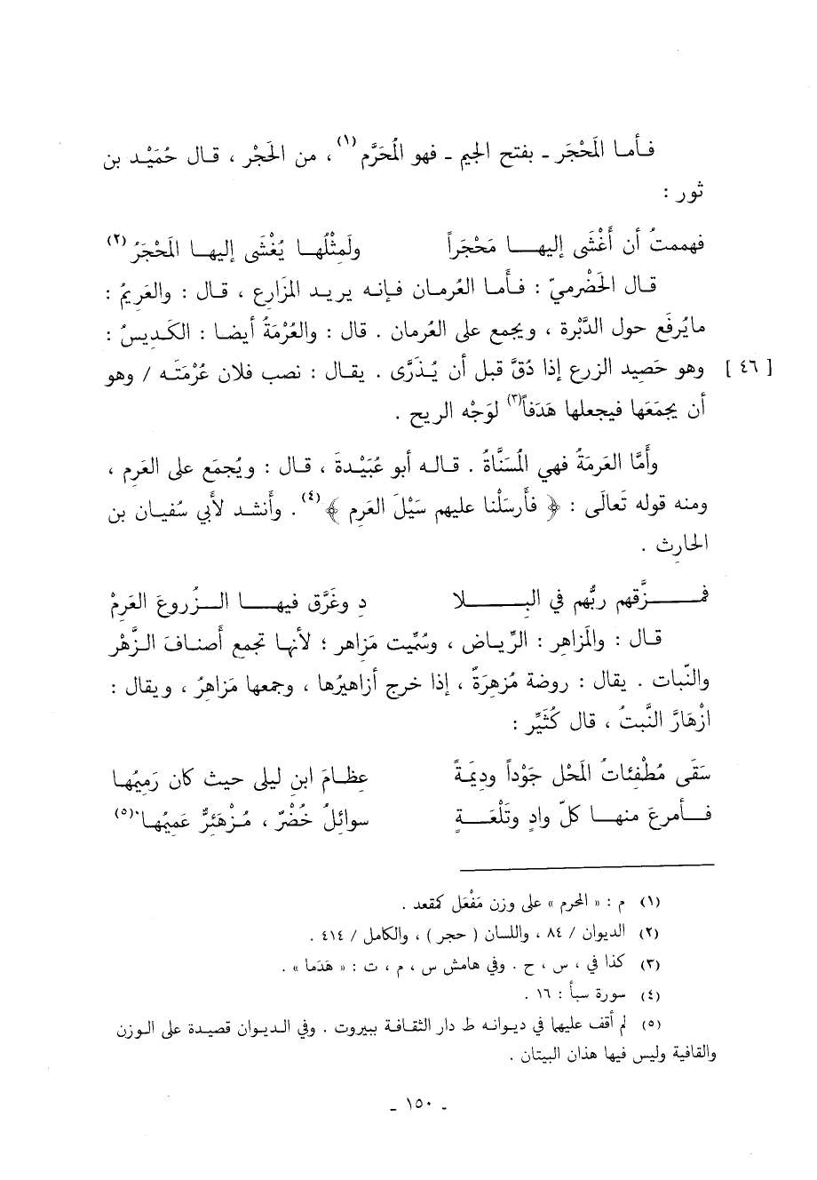 وأَمَّا العَرمَةُ فهي المُسَنَّاةُ قاله أبو عُبَيْدةَ قَالَ ويُجمَع عَلَى العَرِم ومنه قوله تَعالَى: {فَأَرْسَلْنَا عَلَيْهِمْ سَيْلَ الْعَرِمِ} 4 وأَنشد لأَبي سُفيان بن الحارِث: