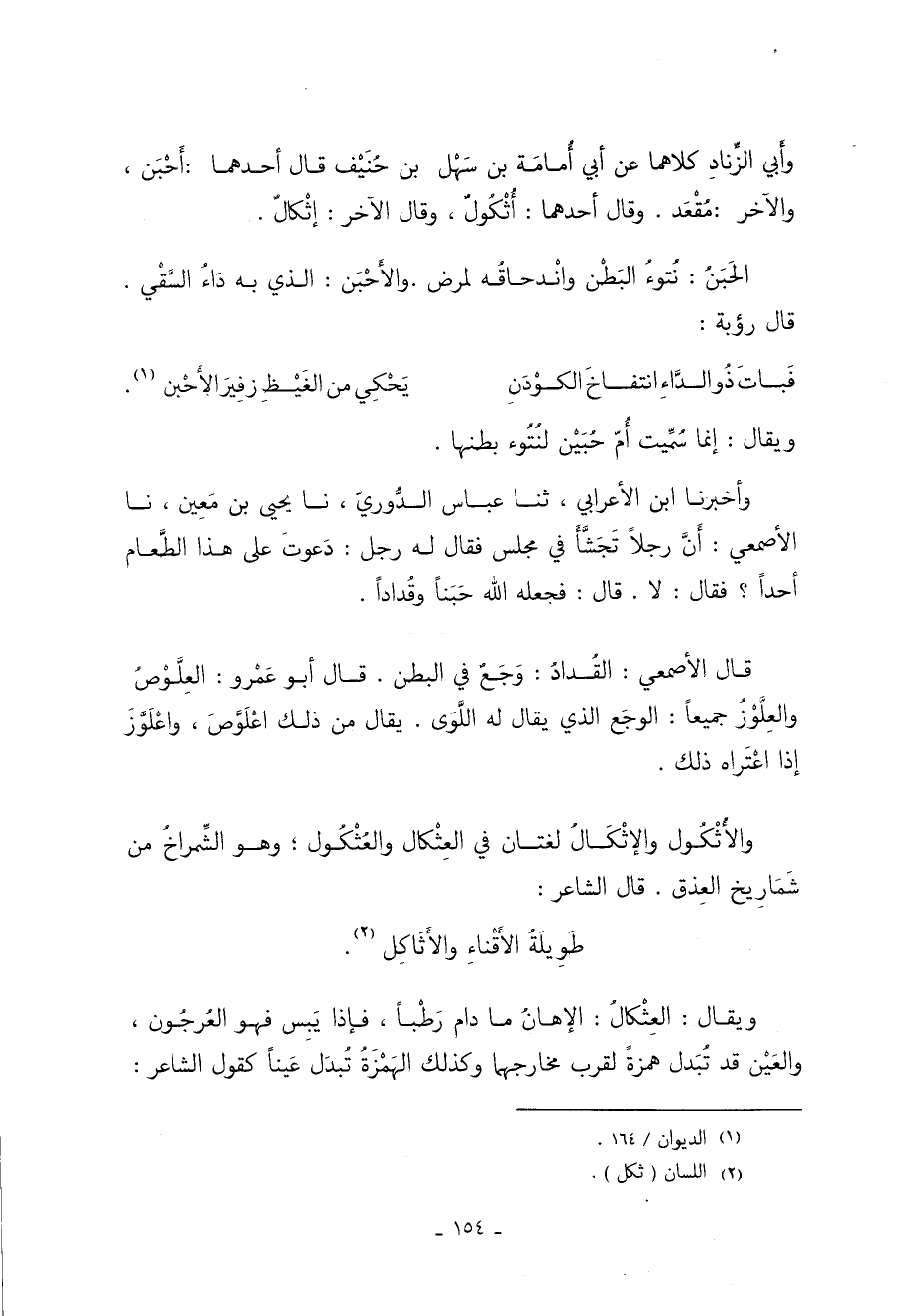 وَأَخْبَرَنَا ابْنُ الأَعْرَابِيِّ ثنا عَبَّاسٌ الدُّورِيُّ نا يَحْيَى بْنُ مَعِينٍ نا الأَصْمَعِيُّ أَنَّ رَجُلا تَجَشَّأَ فِي مَجْلِسٍ فَقَالَ لَهُ رَجُلٌ دَعَوْتَ عَلَى هَذَا الطَّعَامِ أَحَدًا فَقَالَ لا قَالَ فَجَعَلَهُ اللَّهُ حَبَنًا وَقُدَادًا.