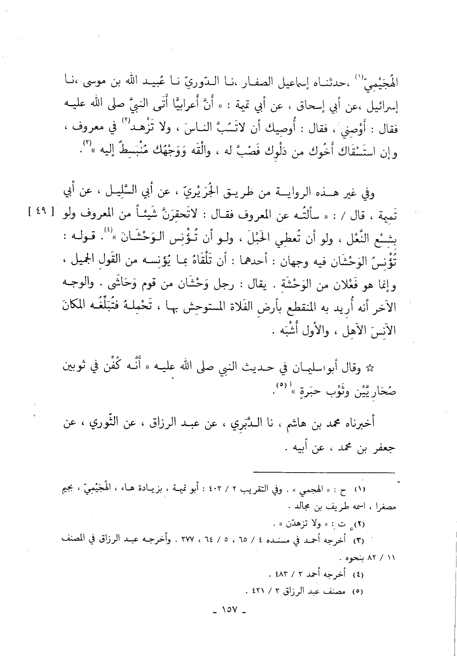 الْهُجَيْمِيِّ 1 حَدَّثَنَاهُ إِسْمَاعِيلُ الصَّفَّارُ نا الدُّورِيُّ نا عُبَيْدُ اللَّهِ بْنُ مُوسَى نا إِسْرَائِيلُ عَنْ أَبِي إِسْحَاقَ عَنْ أَبِي تَمِيمَةَ أَنَّ أَعْرَابِيًّا أَتَى النَّبِيَّ صَلَّى اللَّهُ عَلَيْهِ وَسَلَّمَ فَقَالَ: أَوْصِنِي فَقَالَ: "أُوصِيكَ أَنْ لَا تَسُبَّ النَّاسَ وَلَا تَزْهَدْ 2 فِي مَعْرُوفٍ وَإِنِ اسْتَسْقَاكَ أَخُوكَ مِنْ دَلْوِكَ فَصُبَّ لَهُ وَالْقَهْ وَوَجْهُكَ مُنْبَسِطٌ إِلَيْهِ" 3