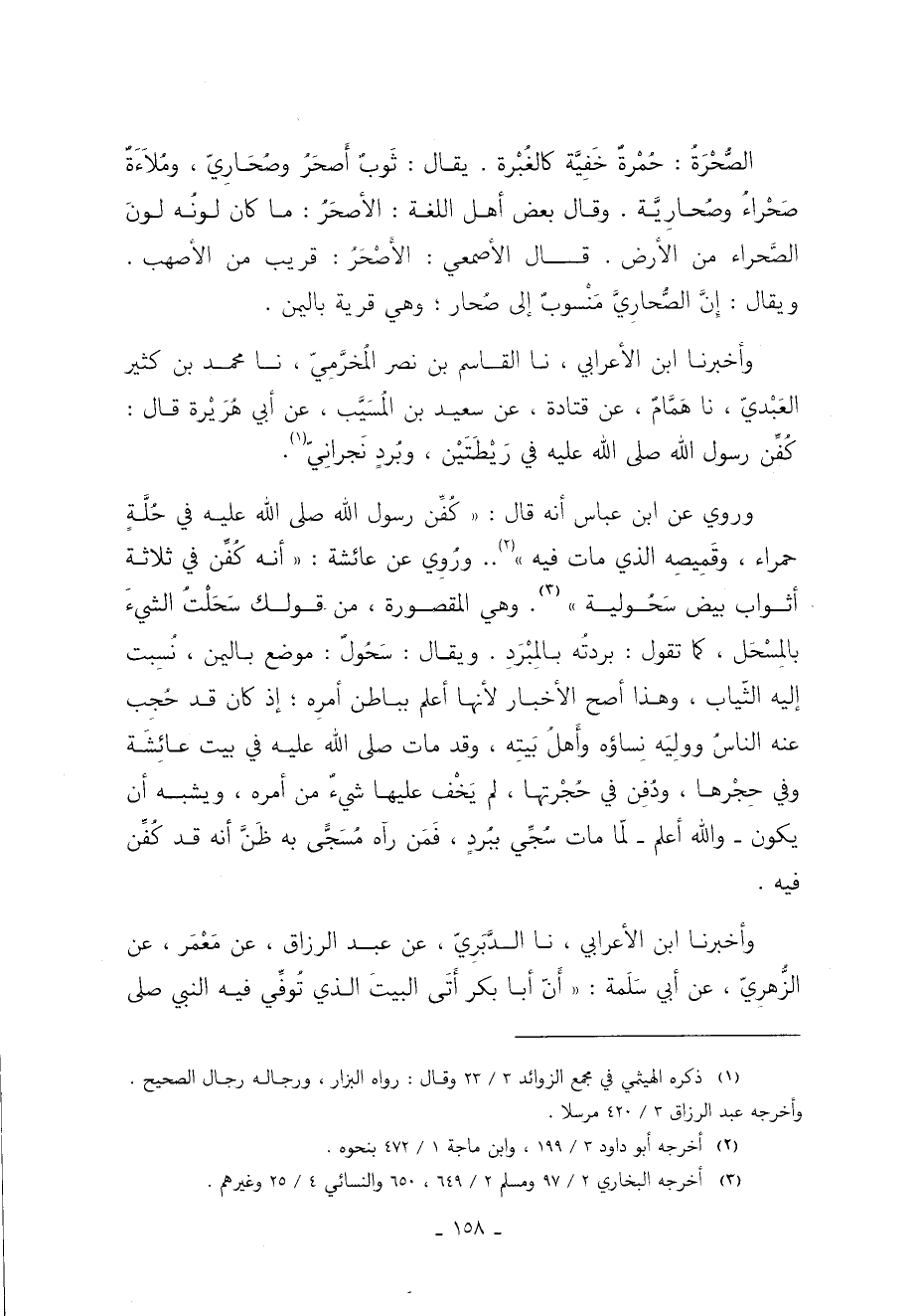 وَرُوِيَ عَنِ ابْنِ عَبَّاسٍ أَنَّهُ قَالَ: كُفِّنَ رَسُولُ اللَّهِ صَلَّى اللَّهُ عَلَيْهِ وَسَلَّمَ فِي حُلَّةٍ حَمْرَاءَ وَقَمِيصِهِ الَّذِي مَاتَ فِيهِ 2 .. وَرُوِيَ عَنْ عَائِشَةَ: أَنَّهُ كُفِّنَ فِي ثَلاثَةِ أَثْوَابٍ بِيضٍ سَحُولِيَّةٍ 3 وهي المقصورة من قولك سَحَلْتُ الشيءَ بالمِسْحَل كما تقول بردتُه بالمِبْرَدِ ويقال سَحُولٌ موضع باليمن نُسِبت إليه الثَّياب وهذا أصح الأخبار لأنها أعلم بباطن أمرِه إذا كان قد حُجِب عنه الناسُ ووِليَه نِساؤه وأَهلُ بيتِه وقد مات في بيت عائِشَة وفي حِجْرها ودُفِن في حُجْرتها لم يَخْف عليها شيءٌ من أمره ويشبه أن يكون -والله أعلم- لَمَّا مات سُجِّيَ ببُردٍ فَمَن رآه مُسَجًّى به ظَنَّ أنه قد كُفَّن فيه.